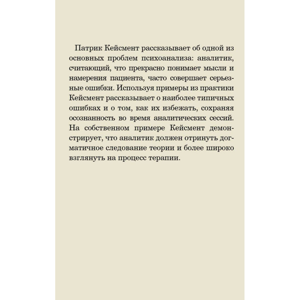 На страницах книги Обучаясь на собственных ошибках. Размышление о технике психоанализа» Патрик Кейсмент рассказывает об одной из основных проблем психоанализа: аналитик, считающий, что прекрасно понимает мысли и намерения пациента, часто совершает серьезные ошибки. Используя примеры из практики, Кейсмент рассказывает о наиболее типичных ошибках и о том, как их избежать, сохраняя осознанность во время аналитических сессий.