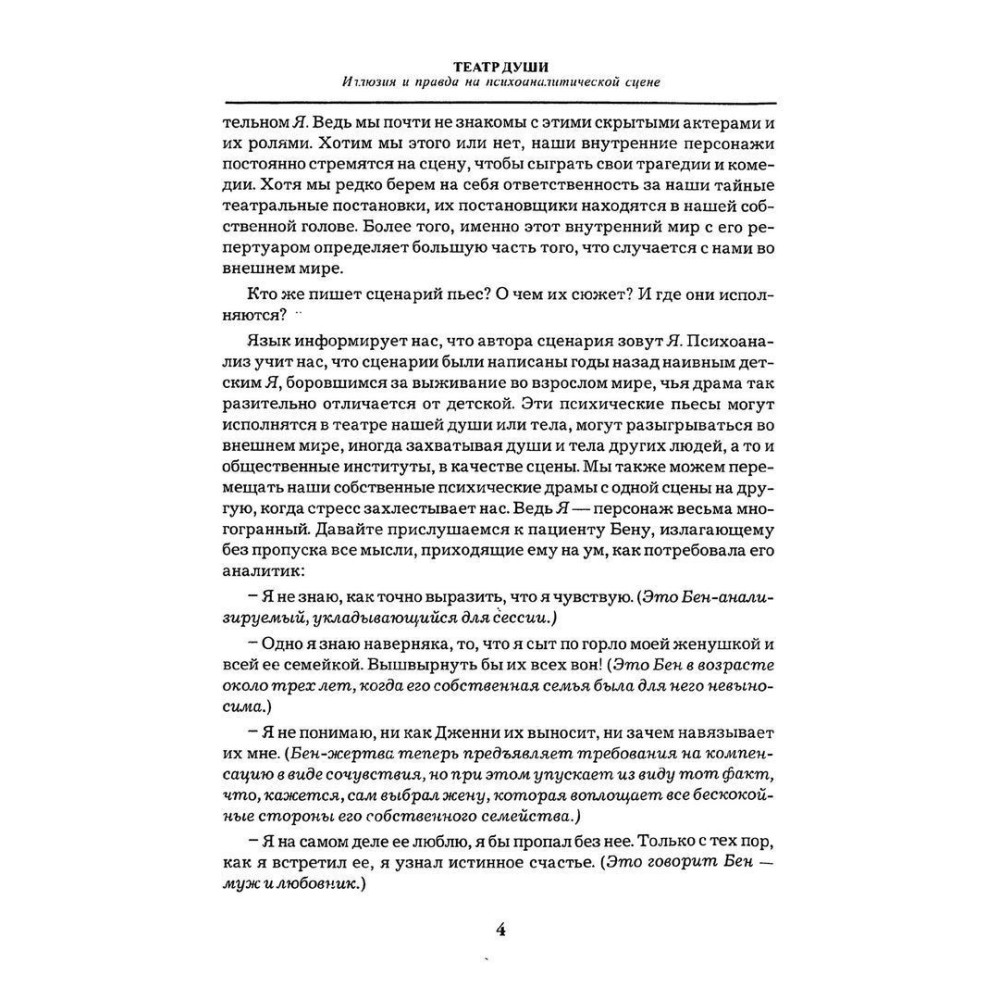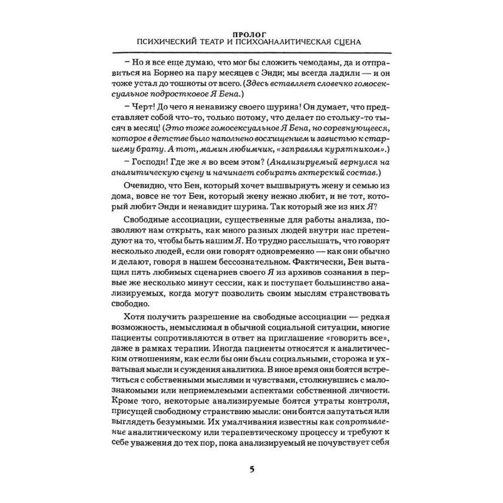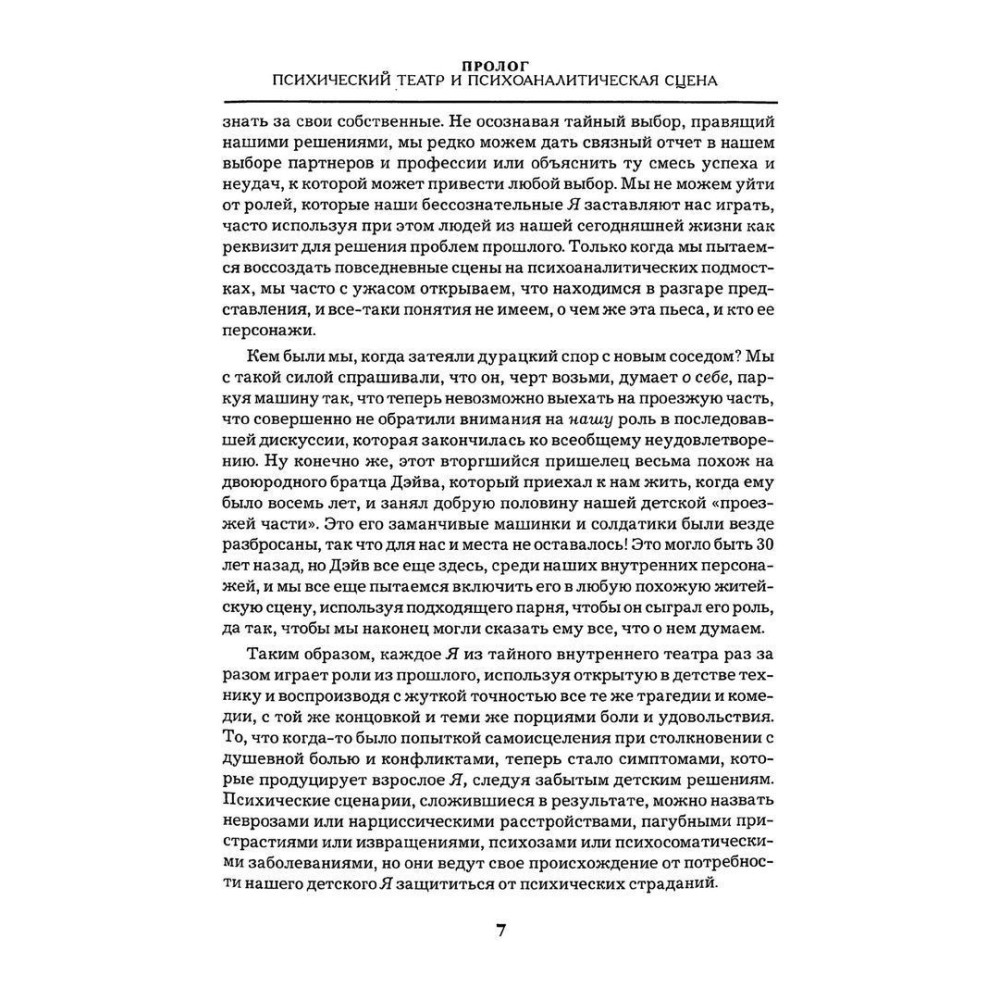 Психоанализ – это театр, на сцене которого исполняется весь наш психический репертуар. В этих пьесах характеры внутренних персонажей претерпевают множество изменений, диалоги переписываются, а роли раздают заново. Анализируемые открывают свою внутреннюю реальность и обретают свою внутреннюю истину, по мере того, как произносят реплики составные части их Я и все люди, игравшие важную роль в их жизни. Сводятся счета с ненавистными и излюбленными фигурами из прошлого; эти фигуры оказываются в распоряжении рассматриваемого во всех своих аспектах, хороших и плохих, а не распоряжаются им; анализируемый готов теперь пересмотреть все, что получил от воспитавших его людей и все, что он с этим наследием сделал.