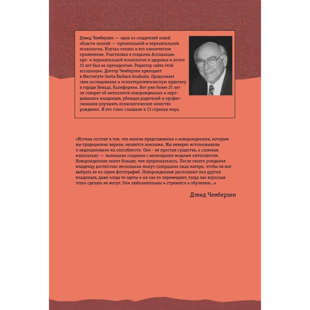 Дэвид Чемберлен – доктор, один из создателей новой области знаний – пренатальной и перинатальной психологии. Доктор Чемберлен преподает в Институте Santa Barbara Graduate и продолжает свои исследования и психотерапевтическую практику в Неваде, Калифорния.