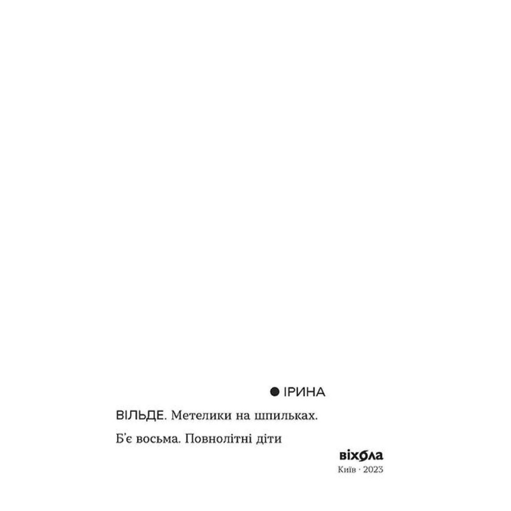 «Бабочки на шпильках. Бьет восьмое. Совершеннолетние дети» от Ирины Вильде — это сборник текстов о сложности адаптации девочки к взрослому миру, требованиям, ценностям и двойной морали начала 20 века в условиях Первой мировой войны, где даже собственный дом становится местом психологических травм и сексуального насилия. Уже там Дарка чувствует себя пришпиленной бабочкой и красочным, празднично одетым существом, которым любуются «ценители коллекции». 13-летняя девочка существует, прежде всего, для того, чтобы им нравиться и развлекать их. Школа и общественная жизнь только усиливают чувство удушья для девушки, ведь другого выбора у нее нет. Такое давление в конце концов подталкивает Дарку изменять свой путь делать более осознанный политический выбор — начиная от гимназической организации, в которой Дарка больше участвует из любопытства к украинскому языку и культуре, и заканчивая активным участием в украинском движении Буковины.
