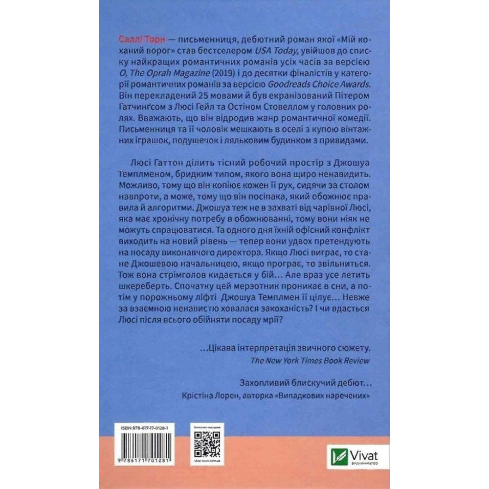 «Мой любимый враг» от Салли Торн рассказывает о Люси Гаттоне, которая делит тесное рабочее пространство с неприятным Джошуа Темплменом, которого она искренне ненавидит. Возможно, потому что он копирует каждое ее движение, сидя за столом напротив, а может, потому, что он муртад, обожающий правила и четко сработанные алгоритмы.
