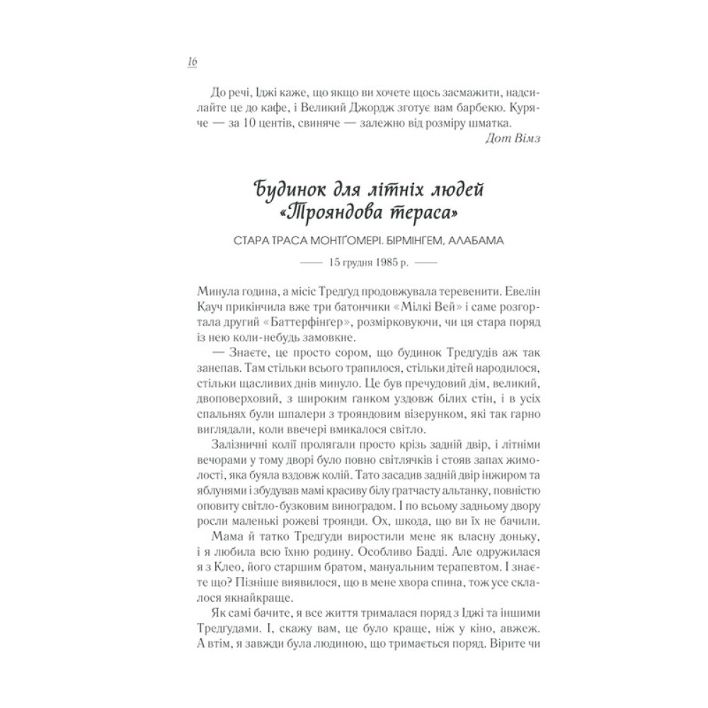 Нинни же рассказывает Эвелин истории их городка: о девушке, которая после гибели брата находит силы жить дальше; о разбитом сердце красавицы Руфь; о странствующем рабочем, который влюбился в Руфь; о безработных, которых в кафе «Остановка» кормили бесплатно... Эти истории обладают такой силой, что меняют к лучшему жизнь читающих.