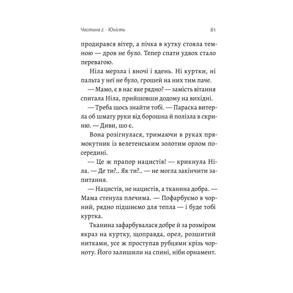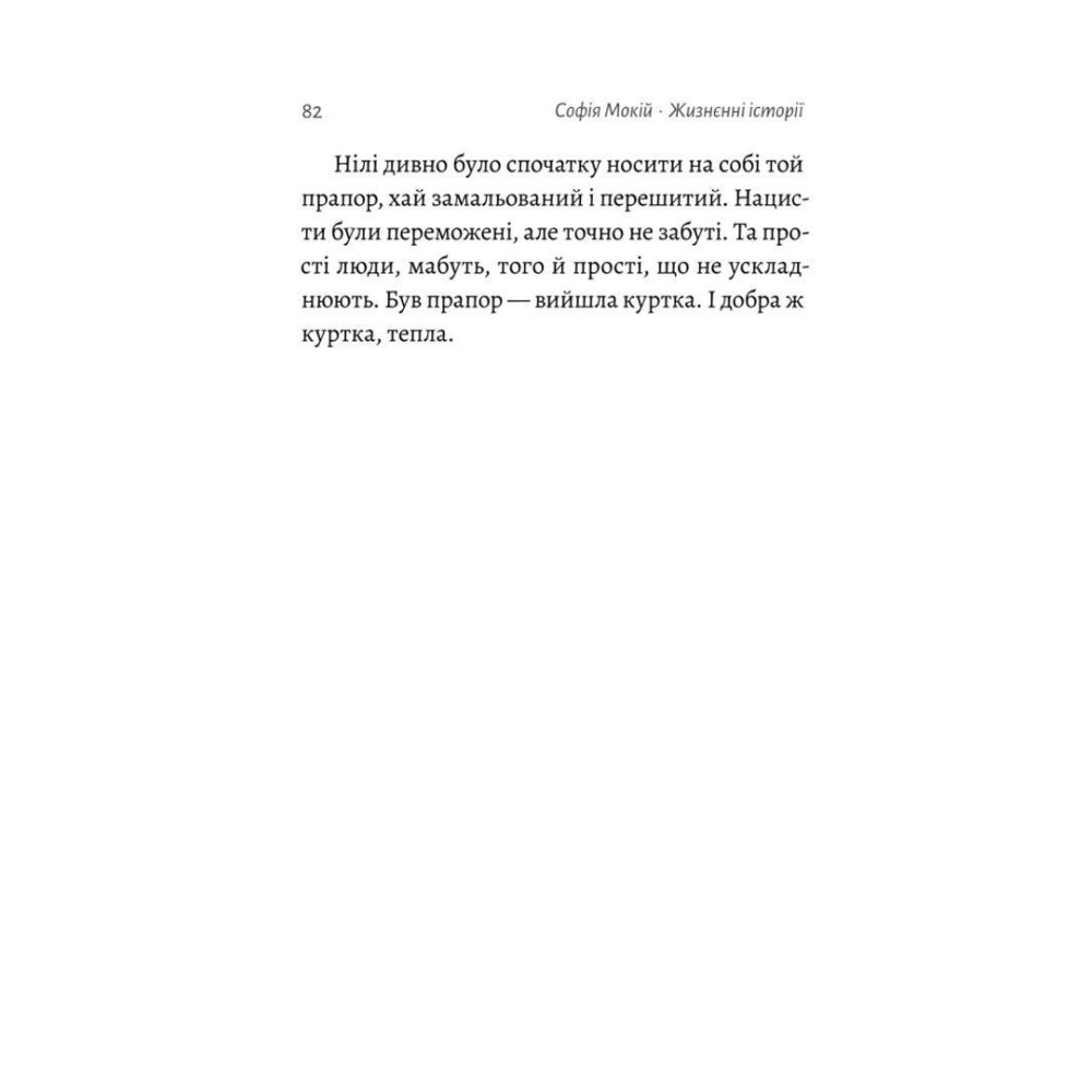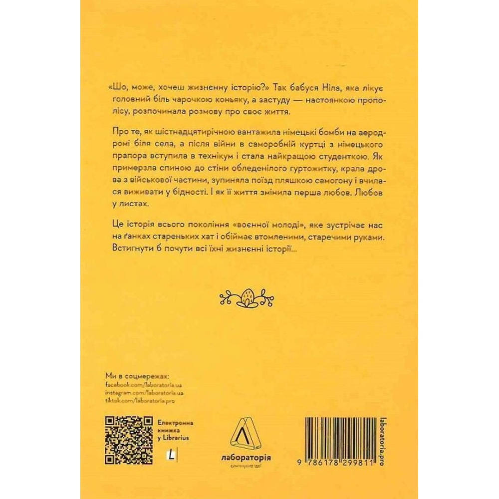 София Мокий представляет книгу «Жизненные истории. О будничном, любви и немного соли», в которой рассказывает биографию собственной бабушки Нилы, которая пережила не только страшную Вторую мировую войну, но и крах Советского союза и бандитские 90-е сквозь призму привычных обыденных дел, в которых современные читатели узнают историю и своих родных, но больше. шестнадцатилетней грузила немецкие бомбы на аэродроме возле села, а после войны в самодельной куртке из немецкого флага поступила в техникум и смогла стать лучшей его студенткой. Как-то примерзла спиной к стене обледенелого общежития и была вынуждена воровать дрова из воинской части, учась выживать в бедности, а позже смогла в необычных обстоятельствах остановить поезд обычной бутылкой самогона. Вплоть до тех пор, как ее жизнь не изменила первой любви. Любовь, которая началась с писем.