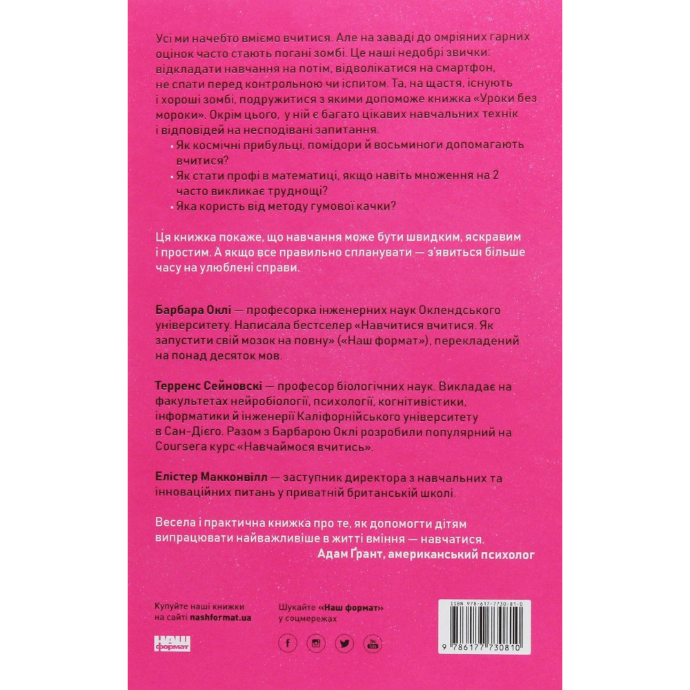 Все мы вроде бы умеем учиться. Но нa помехе к омpийным гарным оценкам частенько стают поганые зомби. Это наши недостатки привычки: откладывать обучение на потом, отвлекаться на смартфон, не спать перед контрольной или экзаменом. Та, к счастью, существуют и хорошие зомби, подкрепиться с которыми поможет книга «Уроки без мрака. Хорошие оценки без лишних страданий» по авторству Барбары Окли и Террена Сейновски, а также Элистера Макконвилла.