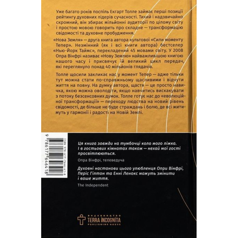 В книге «Новая земля. Осознание жизненной цели Экгарт Толле призывает человечество открыть глаза и признать, что современное сознание людей основано на эгоистическом и ошибочном мышлении. Автор книги предлагает альтернативный вариант сложившейся ситуации. Сейчас, возможно больше, чем раньше, люди имеют шанс построить новый мир, где будет больше здравомыслия и любви. Это приведет к кардинальному внутреннему скачку от нынешнего эгоистического сознания к совершенно новому.