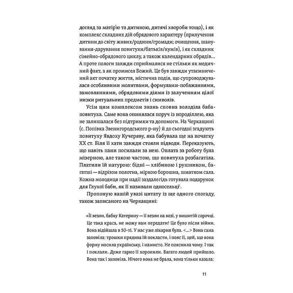 Книга этнологины Елены Боряк «Время рождаться. Повитуха в украинской культурной традиции посвящена уникальной фигуре в истории украинской традиционной культуры — сельской бабе-повитухе. Повитуха, или родовспоможница, не только помогала провести роды и позаботиться о женщине и ребенке, но даже предвещала судьбу новорожденных и получала от священника имя для малышей. Такая традиция в украинских селах сохранялась до недавнего времени.