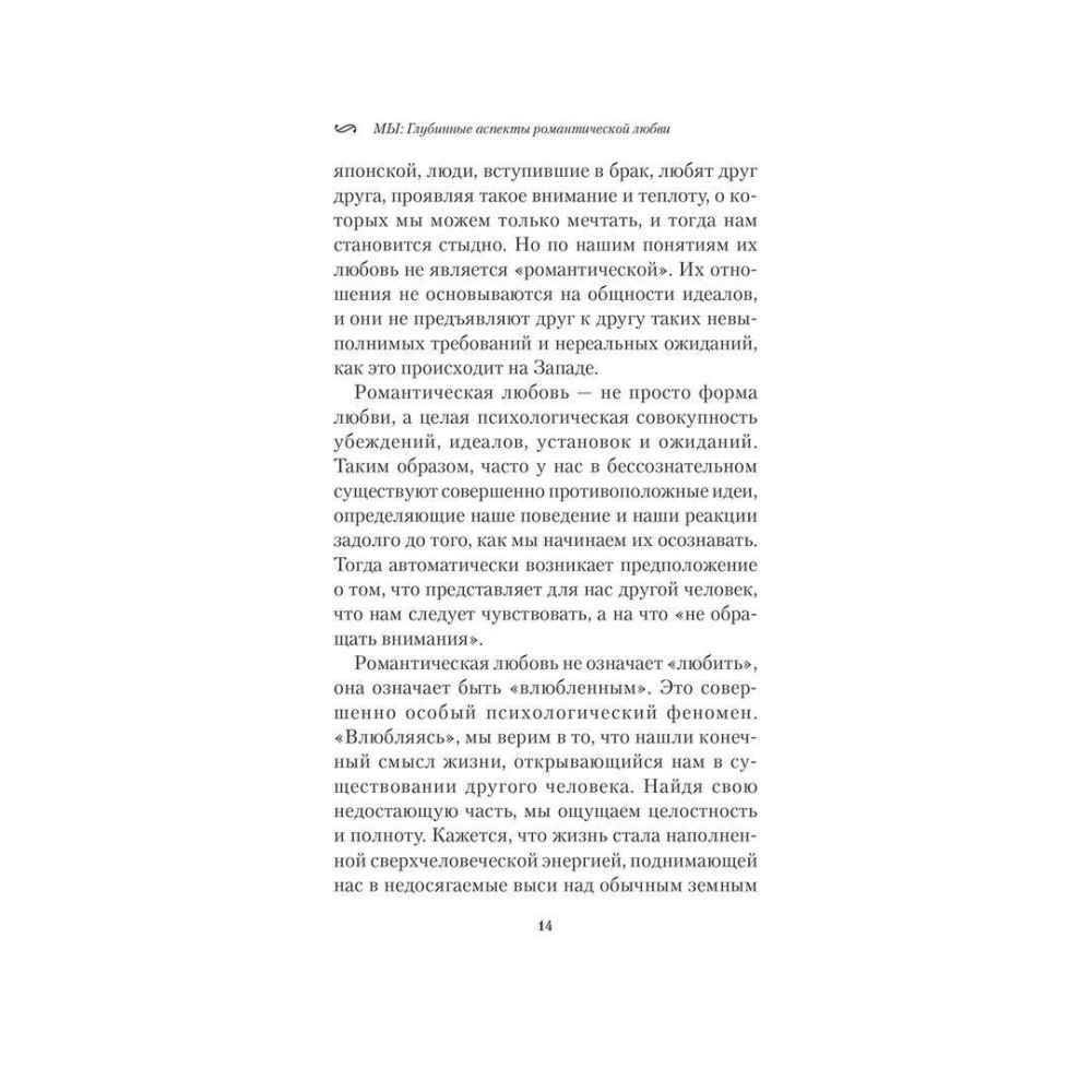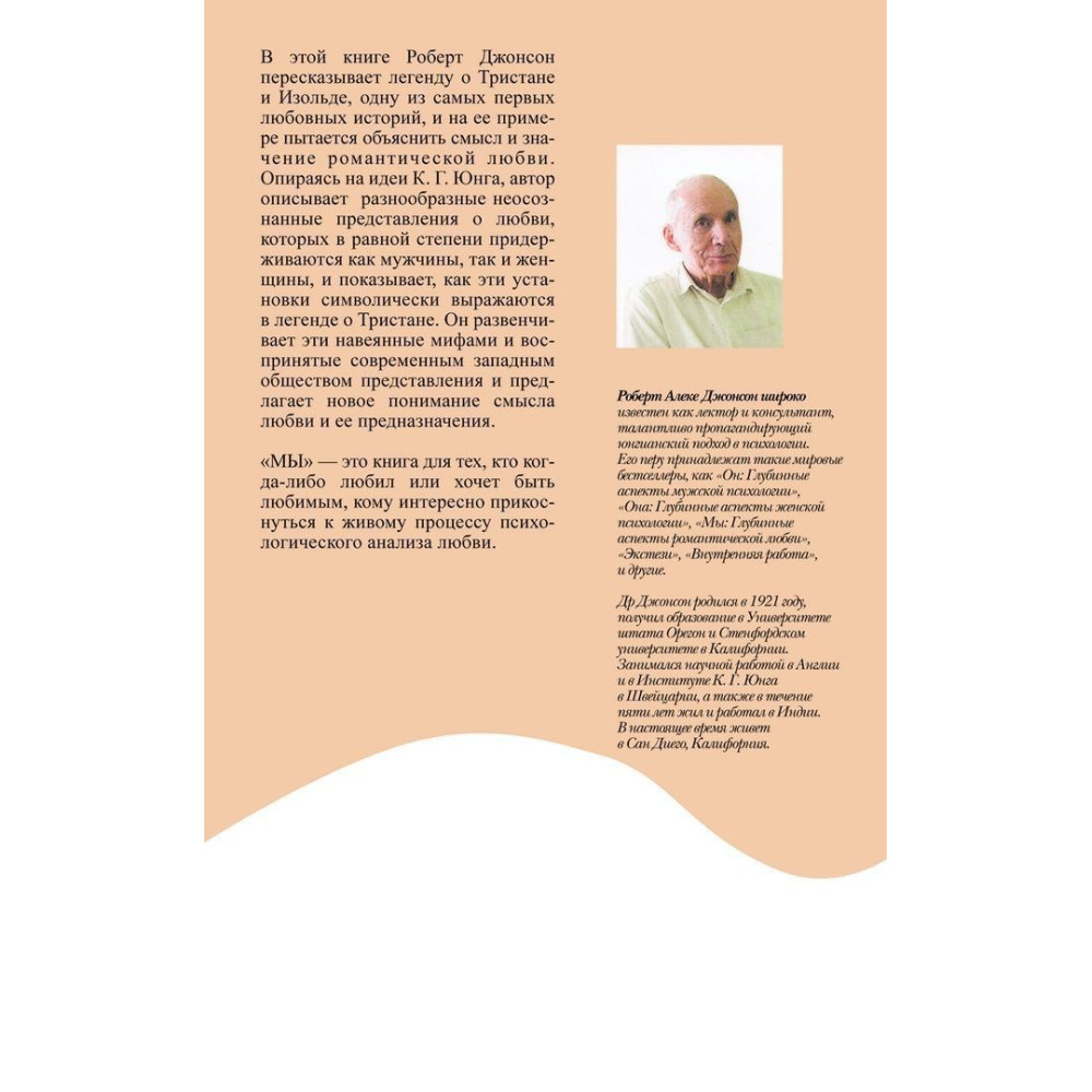 Книга Роберта Джонсона Мы. Глубинные аспекты романтической любви» касается множества следующих тем: «Можем ли мы говорить о психологии любви?», «Что такое любовь и какова его отличие от подлинной любви?», «Какие исторические корни романтической любви, и есть ли такая любовь в наше время?» или «Как изменилась ее психология?».