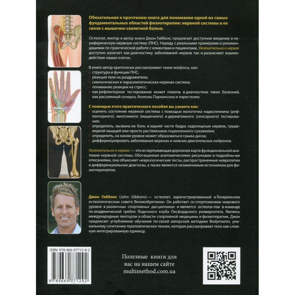 Добро пожаловать в мир неврологии — области, которую Джон Гиббонс описывает как фундаментальную и увлекательную составляющую физиотерапии, без которой немыслима хорошая практика. В то время как многие терапевты относятся к этой теме с опаской, Гиббонс положил ее в основу своих лекций и книг, в которых он преподает лаконичным и доступным языком самые сложные вопросы. Одной из его фундаментальных работ является «Увлекательно о нервах. Практическое пособие для физиотерапевтов».