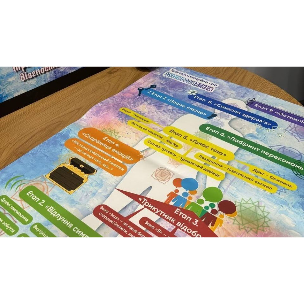 "Психологическая игра "Психосоматика"" - это уникальный инструмент, созданный для глубокого понимания внутренних причин болезней и эмоциональных расстройств. Эта трансформационно диагностическая игра на украинском языке помогает увидеть невидимую связь между телом, эмоциями и убеждениями, которые часто становятся основой психосоматических проявлений.