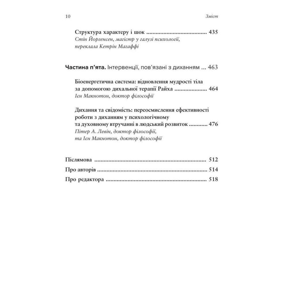Антология включает темы семейных систем, самопсихологии, модели бодинамики — подхода, который прослеживает развитие личности через телесные паттерны, — а также травмы шока и дыхательных практик как средств интеграции психики и тела. В центре внимания – идея, что тело не просто «реагирует» на психические состояния, а является их активным сотворцем и носителем памяти опыта.
