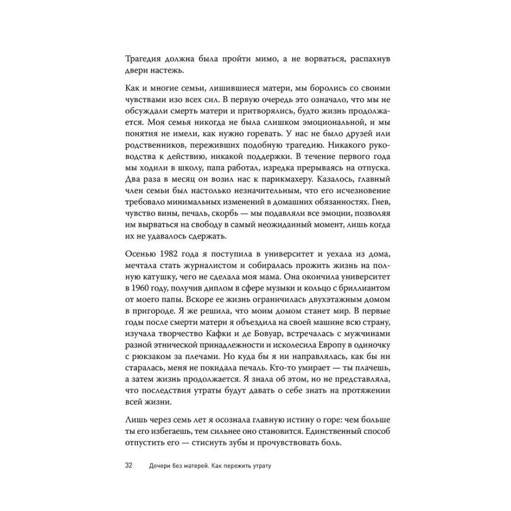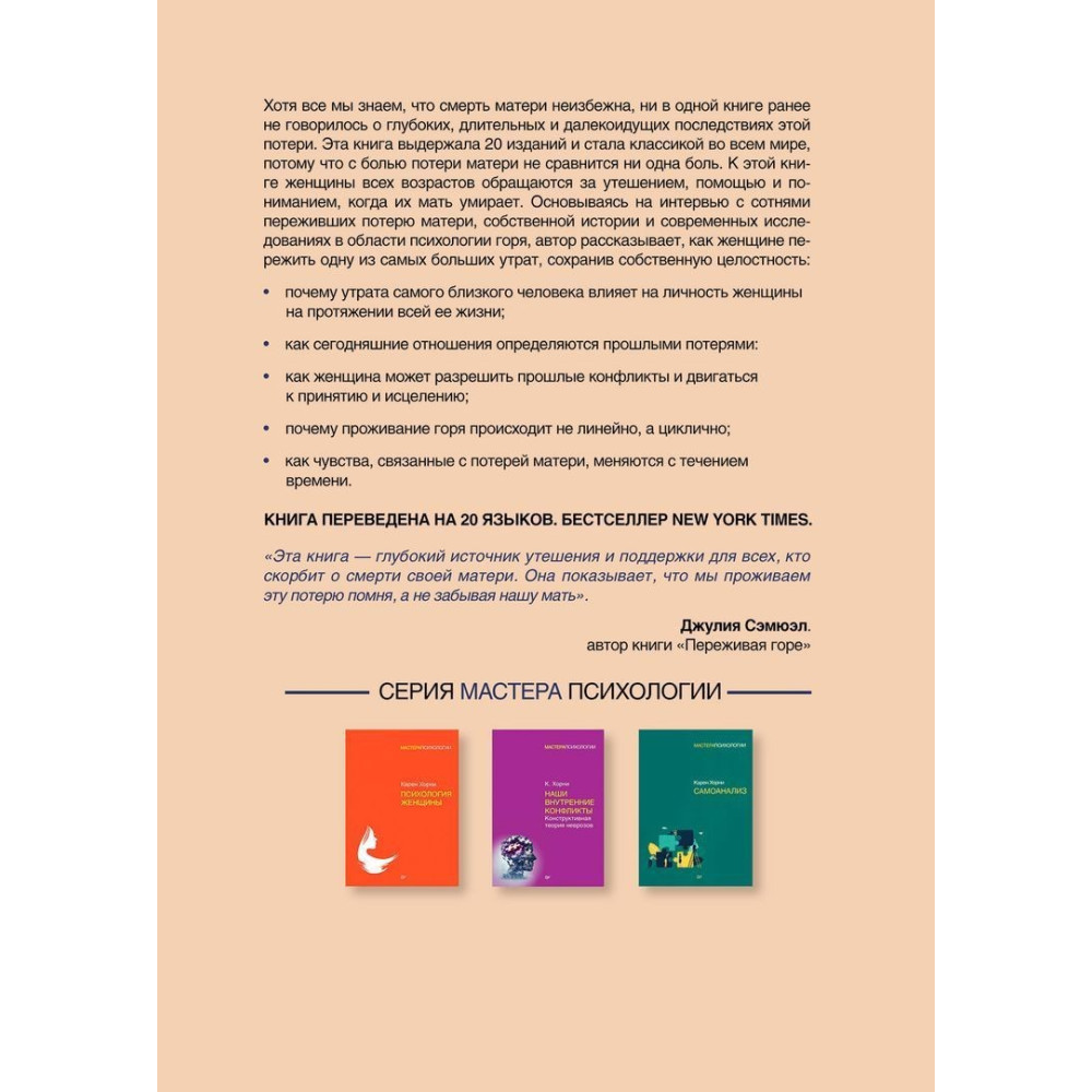 Хотя мы все знаем, что смерть матери неизбежна, ни в одной книге раньше речь не шла о глубоких, длительных и дальновидных последствиях этой потери. «Дочери без матерей. Как пережить потерю» по авторству Гоуп Эдельман выдержала 20 изданий и стала классикой во всем мире, ибо с болью утраты матери не сравнится ни одна боль. К этой книге женщины всех возрастов обращаются за утешением, помощью и пониманием, когда их мать умирает.