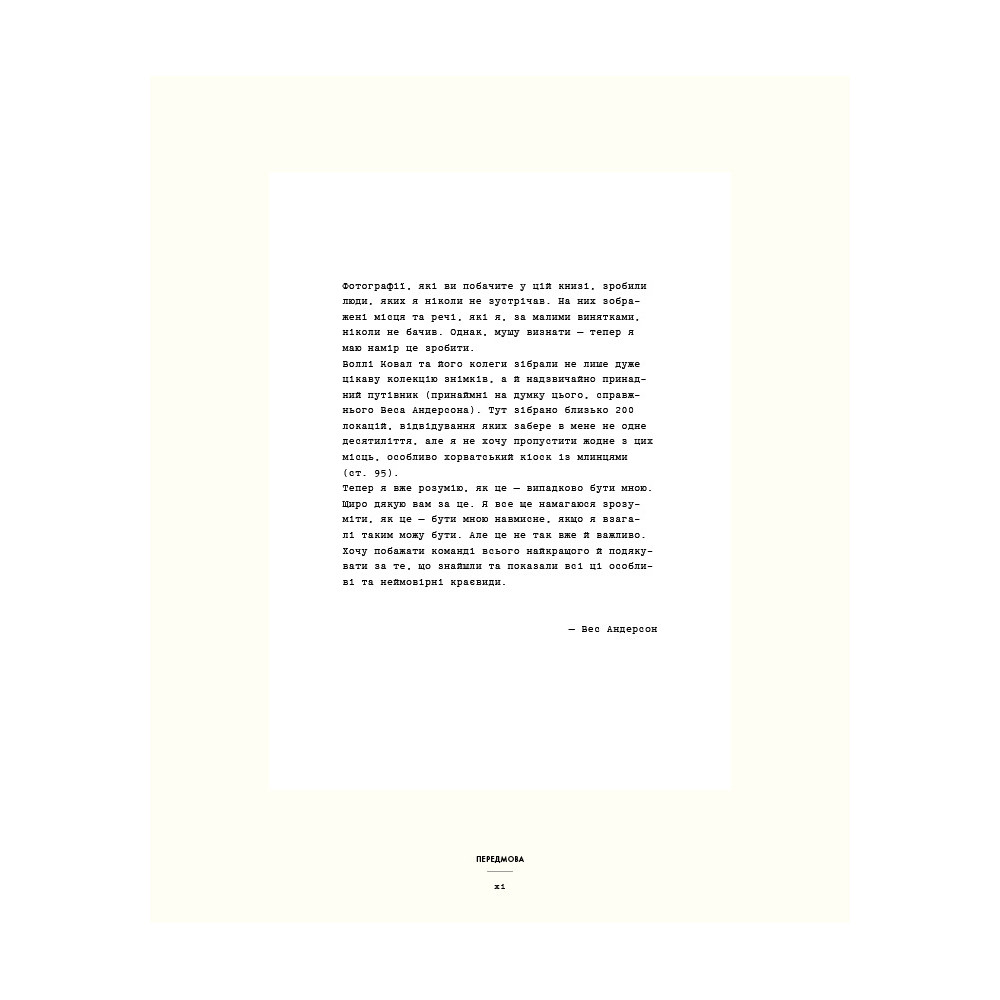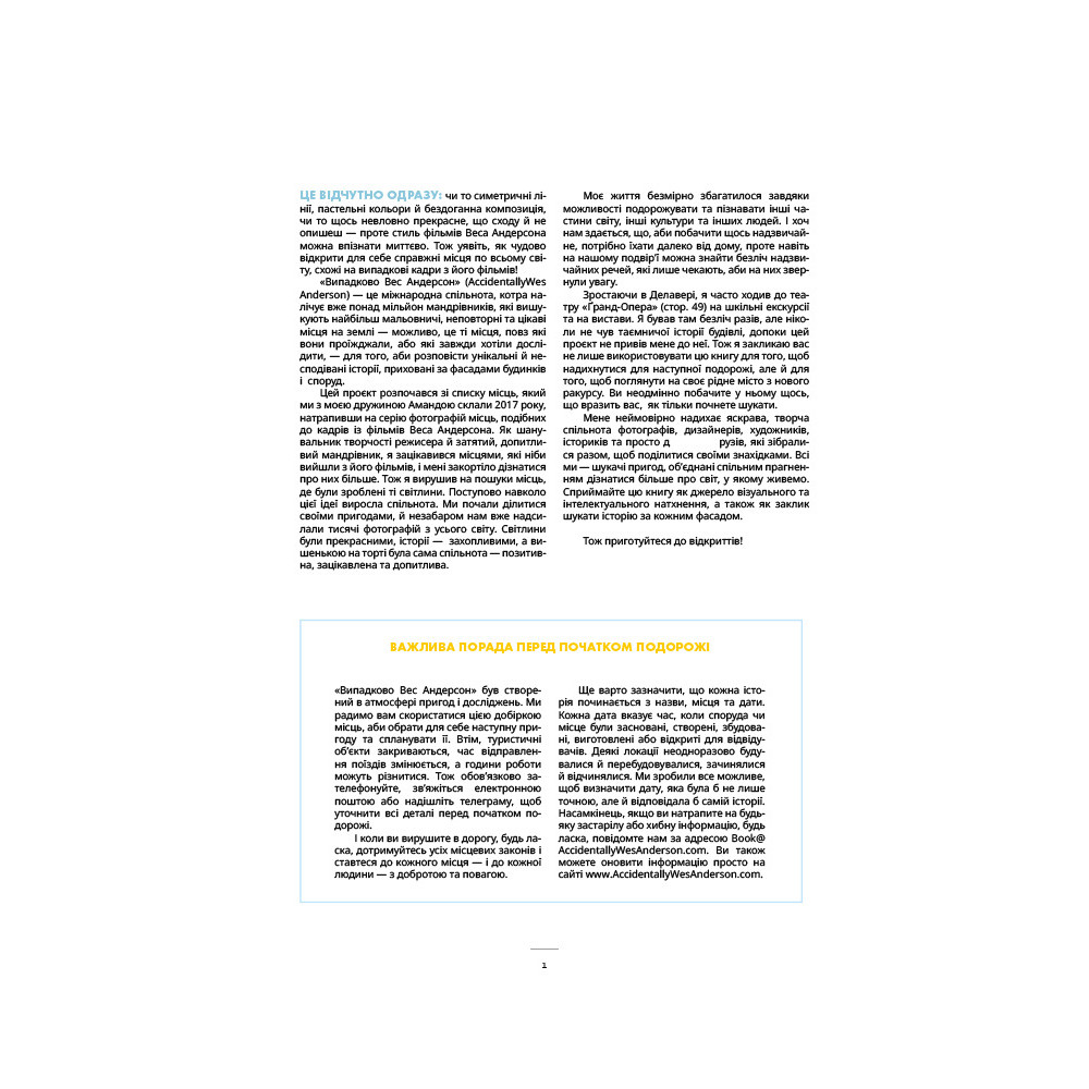 Книга заснована на популярному онлайн-проєкті AccidentallyWesAnderson, який об'єднав мільйони шанувальників режисера. Тут зібрано не лише неймовірні фотографії, а й захопливі історії про кожну локацію. Ця книга – справжня знахідка для фанатів Андерсона, любителів подорожей і всіх, хто цінує естетику та нетипову красу навколишнього світу.