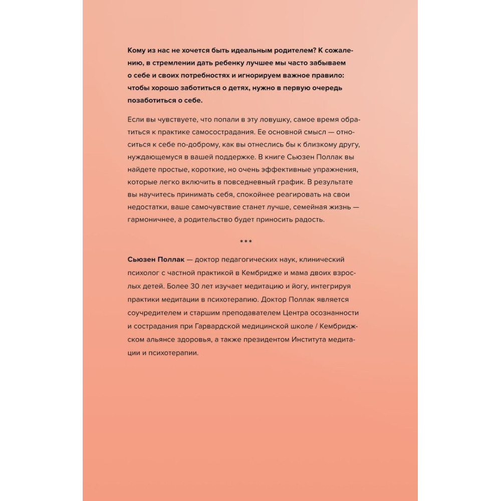 Автор книги «Самосострадание для родителей: Как воспитать счастливого ребенка, заботясь о себе» Сьюзен Поллак, которая является психологиней с более чем 30-летним стажем и мамой двоих детей, на собственном опыте знает, что растить детей непросто. В стремлении дать ребенку лучше родители часто вступают в бесконечное соревнование за звание «идеальная мама» или «идеальный папа». Они забывают о себе и в результате чувствуют себя уставшими и выгоревшими, срываются на детей, а затем ругают себя за это.