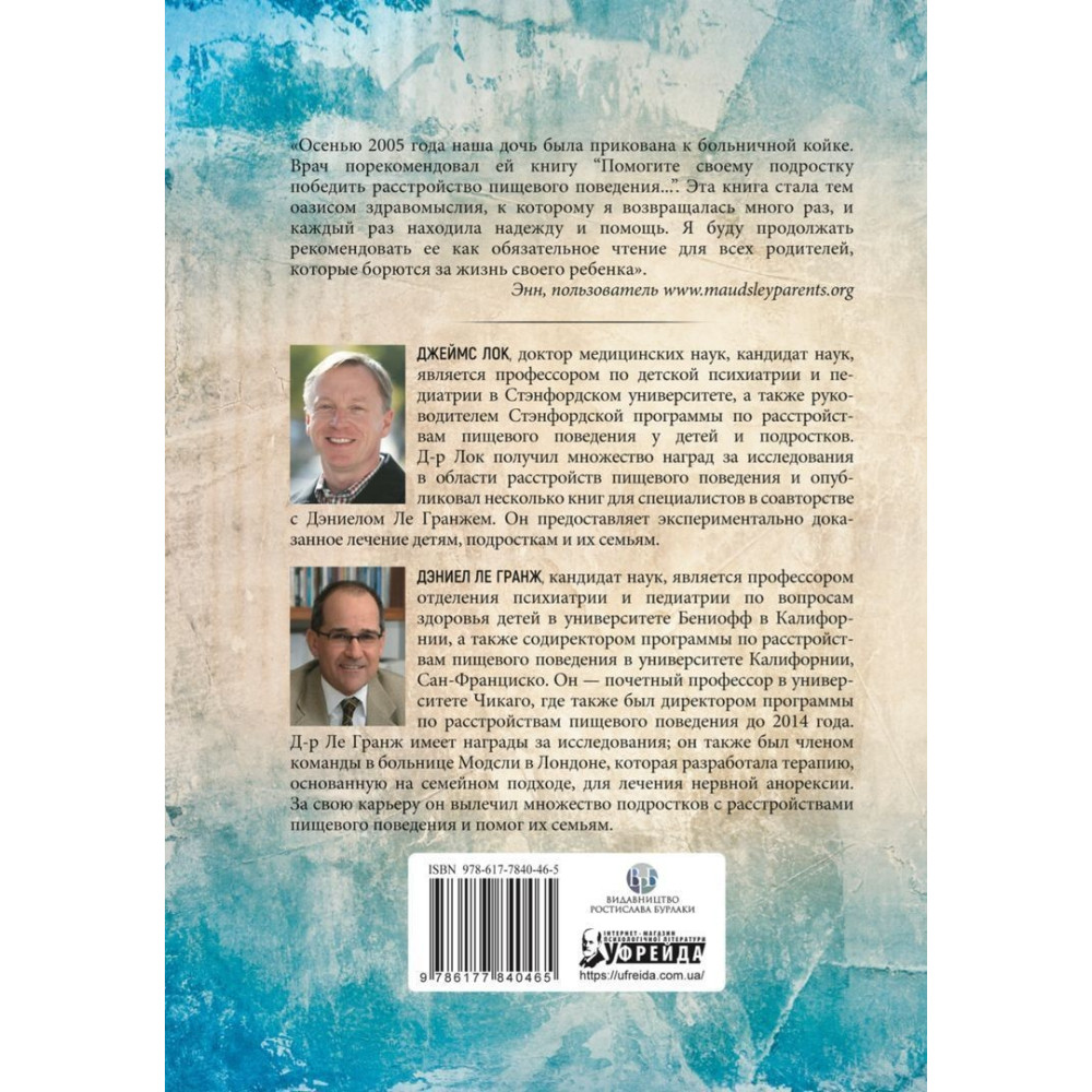 Джеймс Лок и Дэниел Ле Гранж в книге «Помогите вашему подростку справиться с расстройством пищевого поведения» описывают эффективные методы и роль родителей в процессе выздоровления. Как контролировать питание и физическую активность ребенка, как управлять временем еды, прекратить борьбу за власть, связанную с весом и успешно сотрудничать с медицинскими работниками.