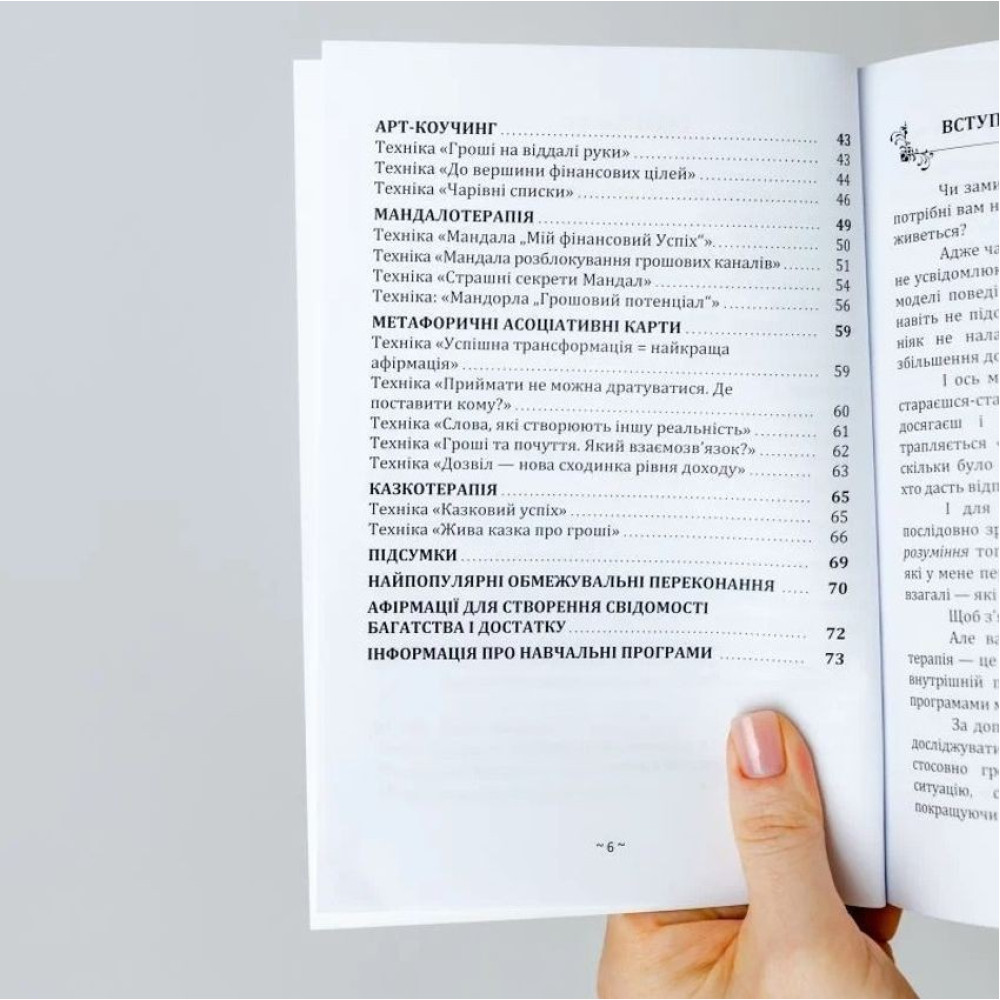 Особливість книги в тому, що в ній безліч арт-терапевтичних технік для роботи з фінансовими запитами. А використовуючи арт-терапевтичні інструменти ми можемо обійти само-саботаж, опір, раціоналізм, піти від звичної моделі поведінки і побачити свою фінансову сторону життя зовсім з іншого боку. Що в свою чергу дуже сильно підвищує шанси змінити непрацюючі моделі на ті, які дозволять покращити фінансовий стан.