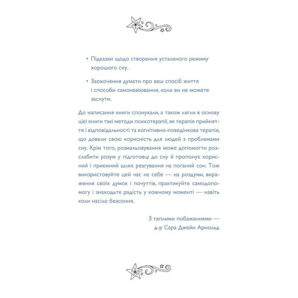 В основу цього видання лягли такі методи психотерапії, як терапія прийняття і відповідальності та когнітивно-поведінкова терапія, що довели свою корисність для людей з проблемами сну. Тут ви знайдете чудові рисунки для розмальовування, доступну інформацію про сон і проблеми із засинанням, а також корисні поради, що допоможуть позбутися безсоння.