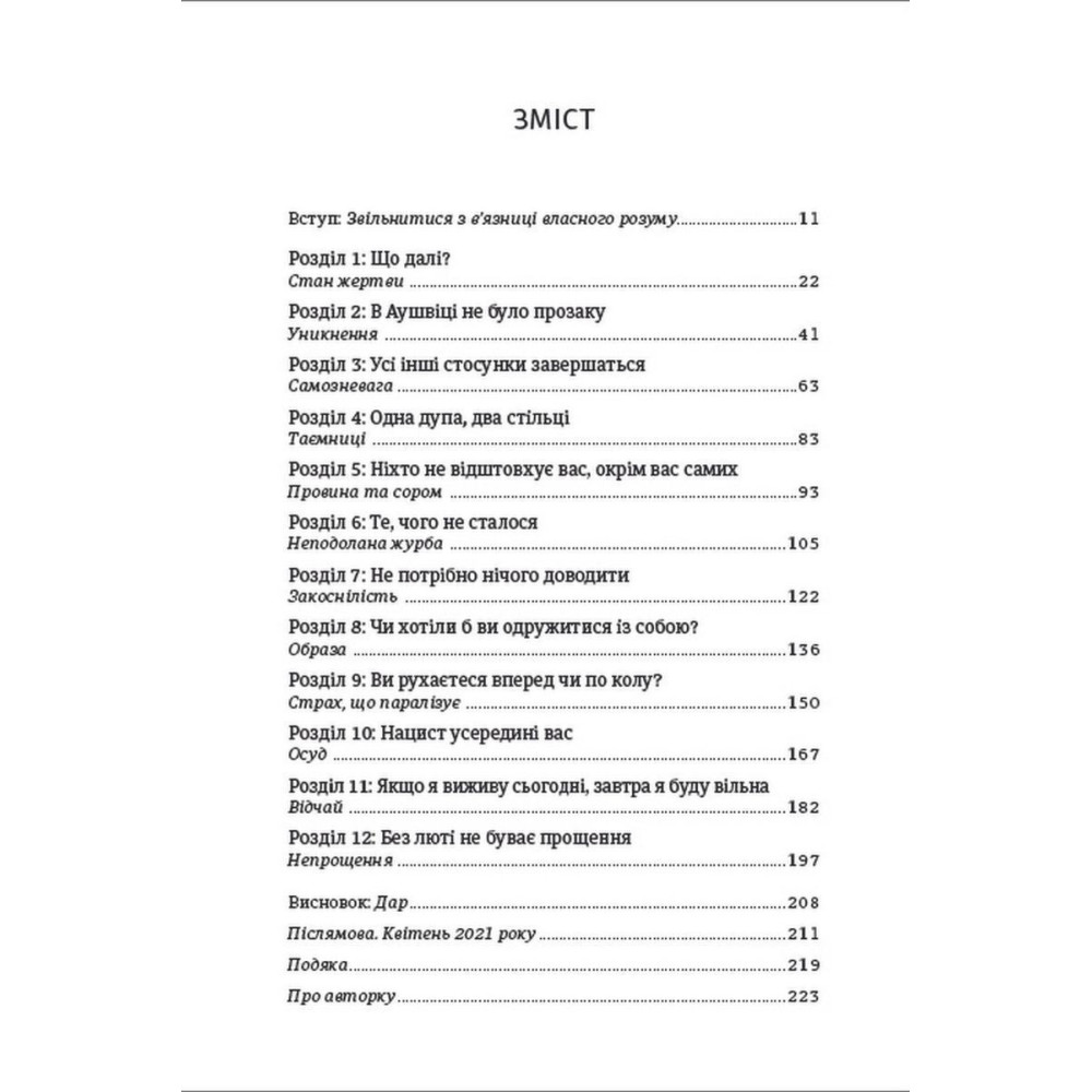 Це своєрідні 12 сеансів від видатної психотерапевтки, які дають підказки як сприймати свої емоції, як позбутись комплексу жертви, зцілитись від дитячих травм, переживати втрати та горе, як виходити з конфліктних ситуацій чи не потрапляти у них, як прийняти і полюбити себе, як позбутися відчуття вини, як навчитись контролювати свої страхи та впоратись з тривожністю.