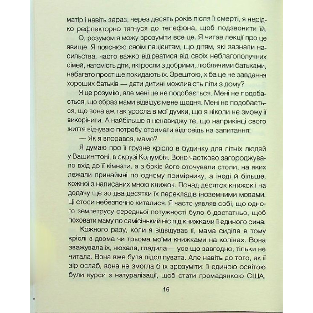 У шістці невеликих психотерапевтичних оповідань, об’єднаних темами смерті, сенсу життя і впливу дитячих травм на нас дорослих, автор відкриває читачу нескінченний ресурс зцілення, закладений в кожному з нас. Пацієнт та лікар тут наче міняються місцями.