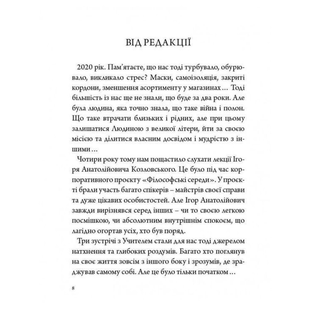 Зараз, у 2024-му, лекції Ігоря Козловського сприймаються набагато глибше, ніж ми відчували раніше. Кожна його фраза, кожен приклад — можливість зрозуміти те, що може повністю змінити життя і вивести його на вашу власну дорогу, до реалізації вашої головної місії. Незважаючи на зовнішні обставини і перешкоди.