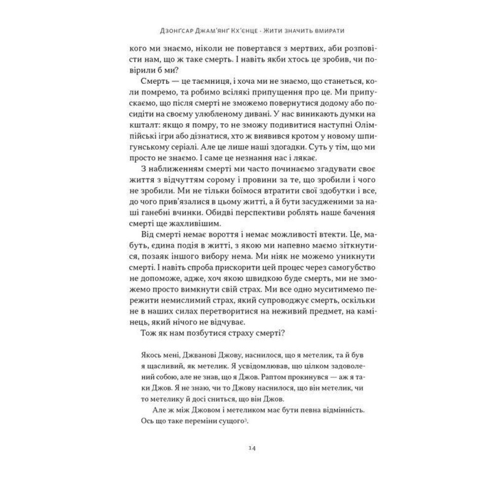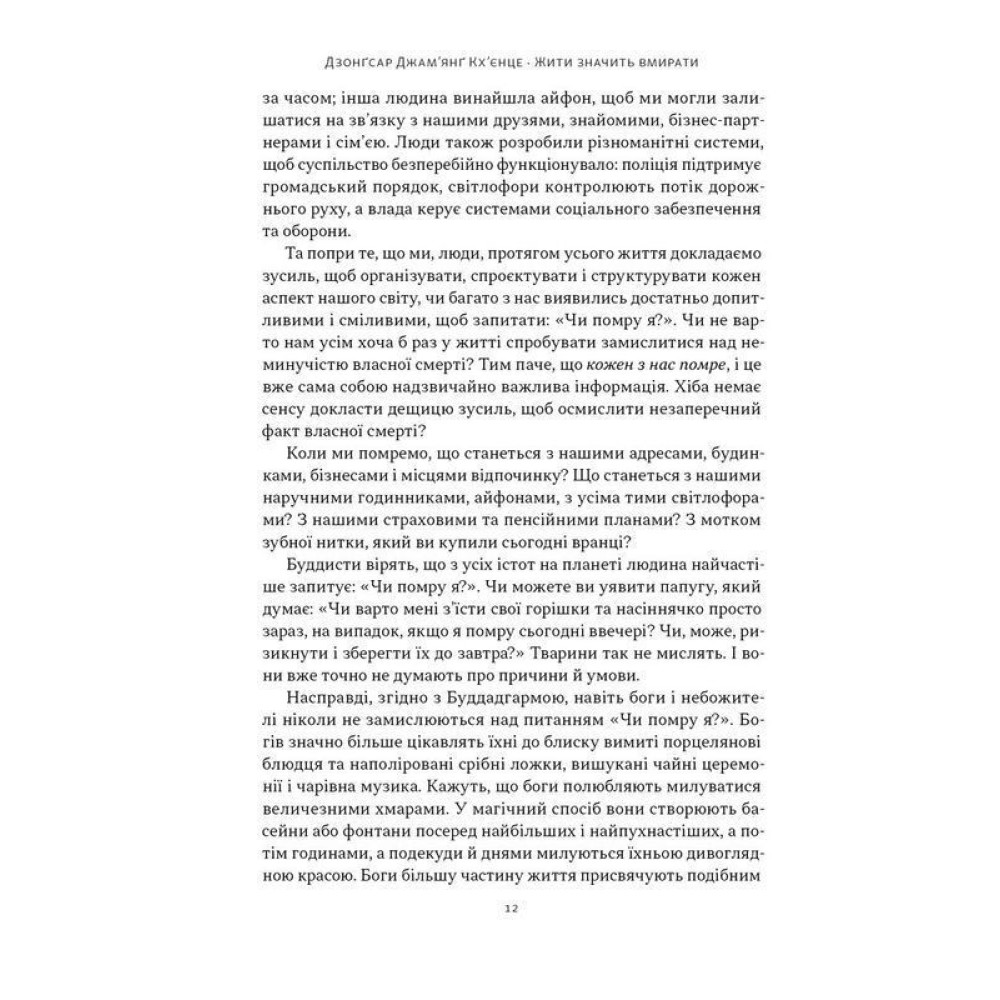Книга «Жити значить вмирати. Як підготуватися до смерті, вмирання і того, що буде далі» від Дзонґсара Джам'янґа Кхьєнце — це глибоке дослідження теми смерті, яке поєднує буддійське вчення з практичними порадами для сучасної людини. Автор, відомий тибетський лама та мислитель, розкриває не лише філософські аспекти кінця життя, а й конкретні способи, як підготуватися до неминучого переходу — як фізично, так і духовно.