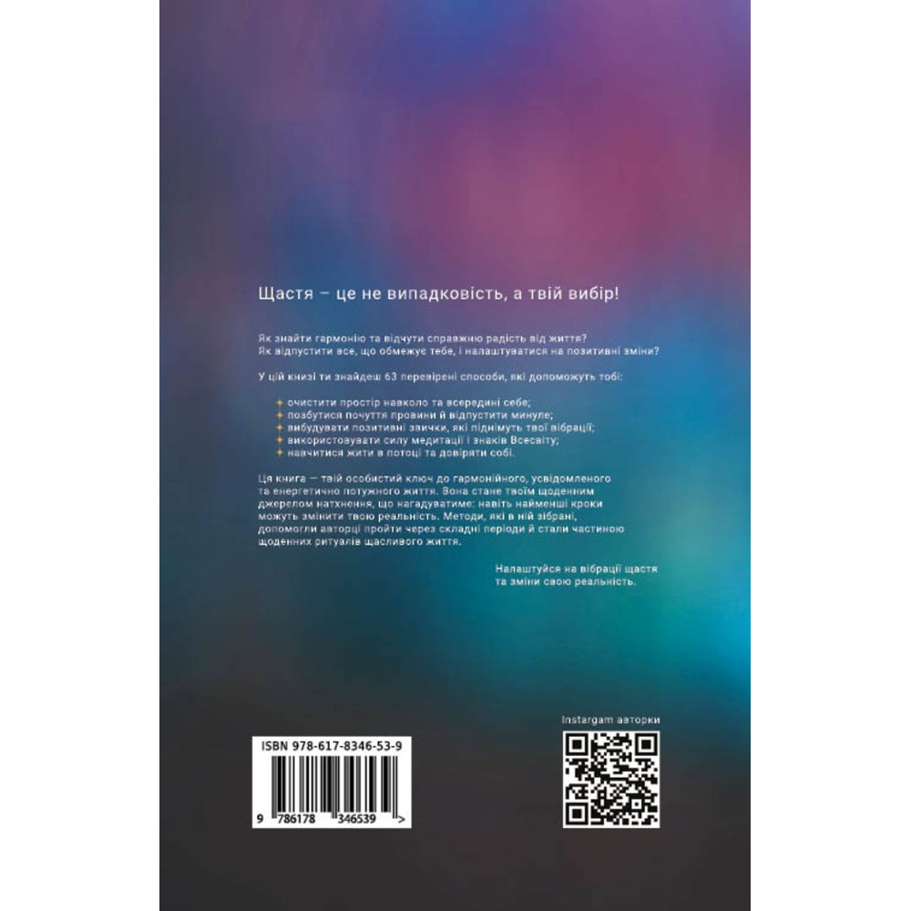 «Шлях до щастя. Мистецтво високих вібрацій» — це натхненний і практичний путівник для дівчат і жінок, які прагнуть жити в гармонії з собою, наповнити будні радістю, світлом і внутрішнім спокоєм. Книга пропонує 63 перевірені способи підвищення вібрацій, які легко інтегрувати у повсякденне життя.