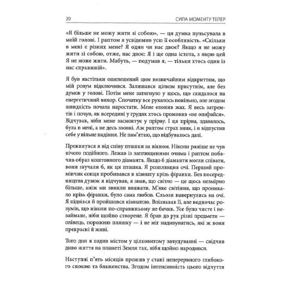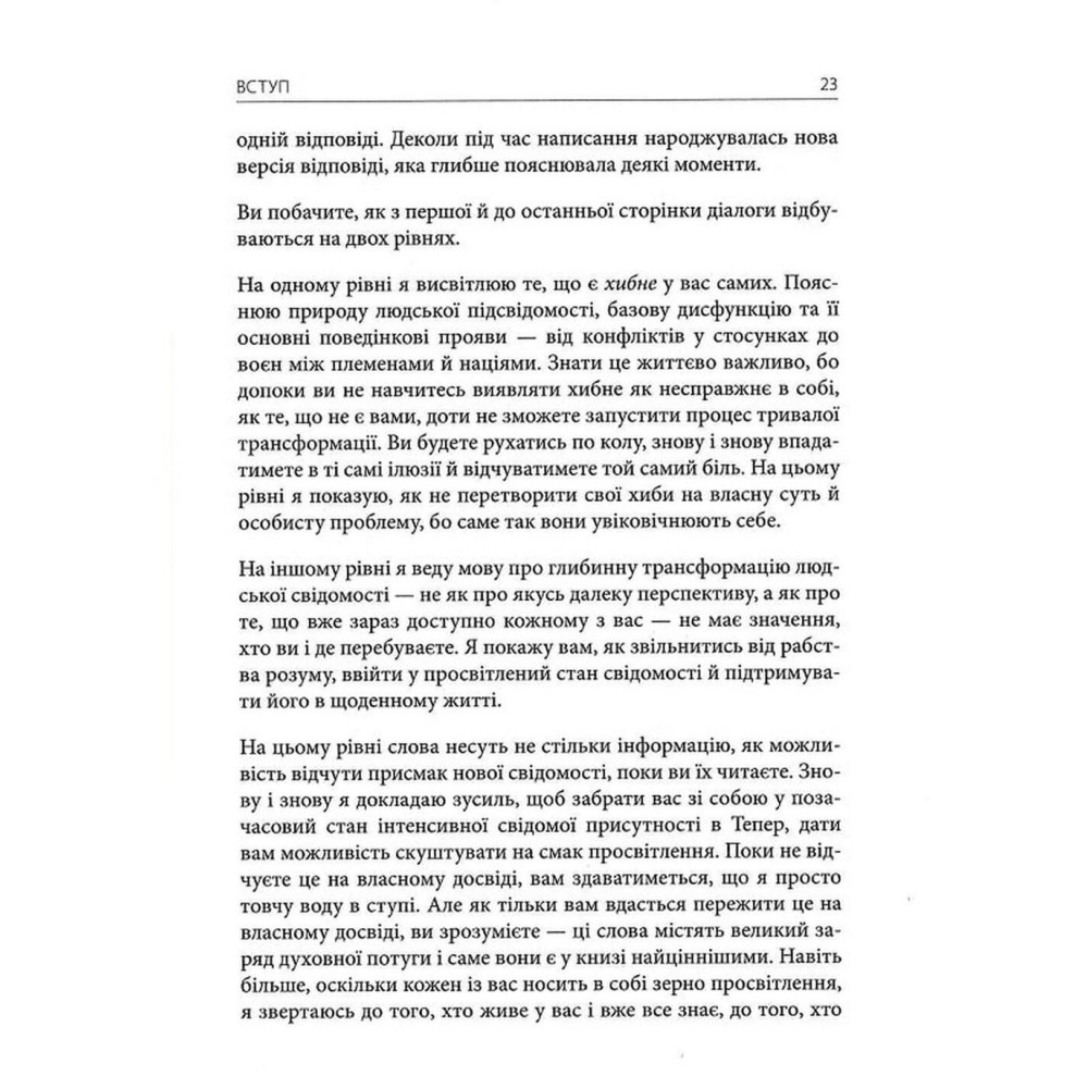 Толле показує, як біль, страх і страждання виникають тоді, коли ми живемо в минулому або майбутньому, і як внутрішній спокій приходить лише тоді, коли ми повністю занурюємося в тепер. Автор просто й глибоко пояснює природу его, ілюзію часу та шлях до пробудження свідомості — не через віру чи догми, а через безпосереднє переживання буття.