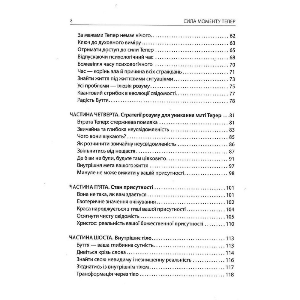 «Сила моменту Тепер» — не лише духовне вчення, а й практичний путівник до миру, ясності та свободи від розумового шуму. Вона допомагає побачити, що справжнє життя розгортається тільки зараз — у тиші усвідомленої присутності.