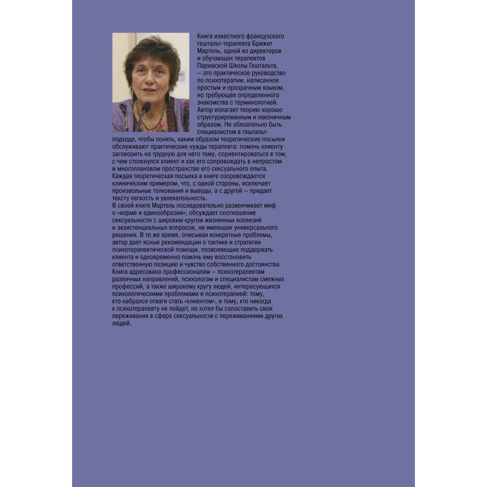 Книжка відомої французької гештальт-терапевтки Бріджит Мартель, однієї з директорів і навчальних терапевтів Паризької Школи Гештальту, «Гештальт-терапия сексуальности» — це практичний посібник із психотерапії, написаний простою та прозорою мовою, але такий, що потребує певного знайомства з термінологією.