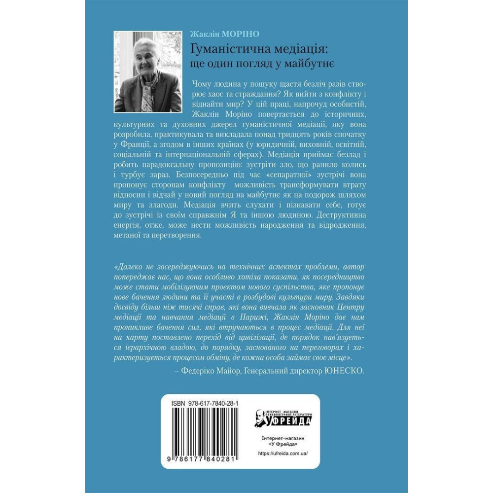 Жаклін Моріно у напрочуд особистій праці «Гуманістична медіація: Ще один погляд у майбутнє» повертається до історичних, культурних та духовних джерел гуманістичної медіації, яку вона розробляла, практикувала та викладала понад тридцять років.