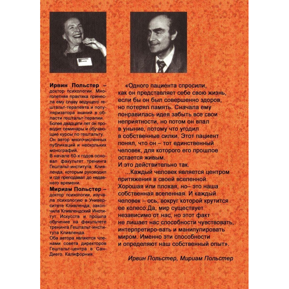 Для багатьох читачів туманні обидва слова, але це справа виправна: чудова книжка «Интегрированная гештальт-терапия: контуры теории и практики» пари знаменитих гештальтистів Ірвіна й Міріам Польстерів відповідає на всі питання про сучасну гештальт-терапію, тож кожен психіатр, психолог, психотерапевт (не кажучи вже про тих, кому «просто цікаво») побачить у книжці багато нового про сьогоднішню, тобто глибоко розроблену й інтегровану гештальт-терапію. Можливо, хтось навіть відкриє її для себе заново.