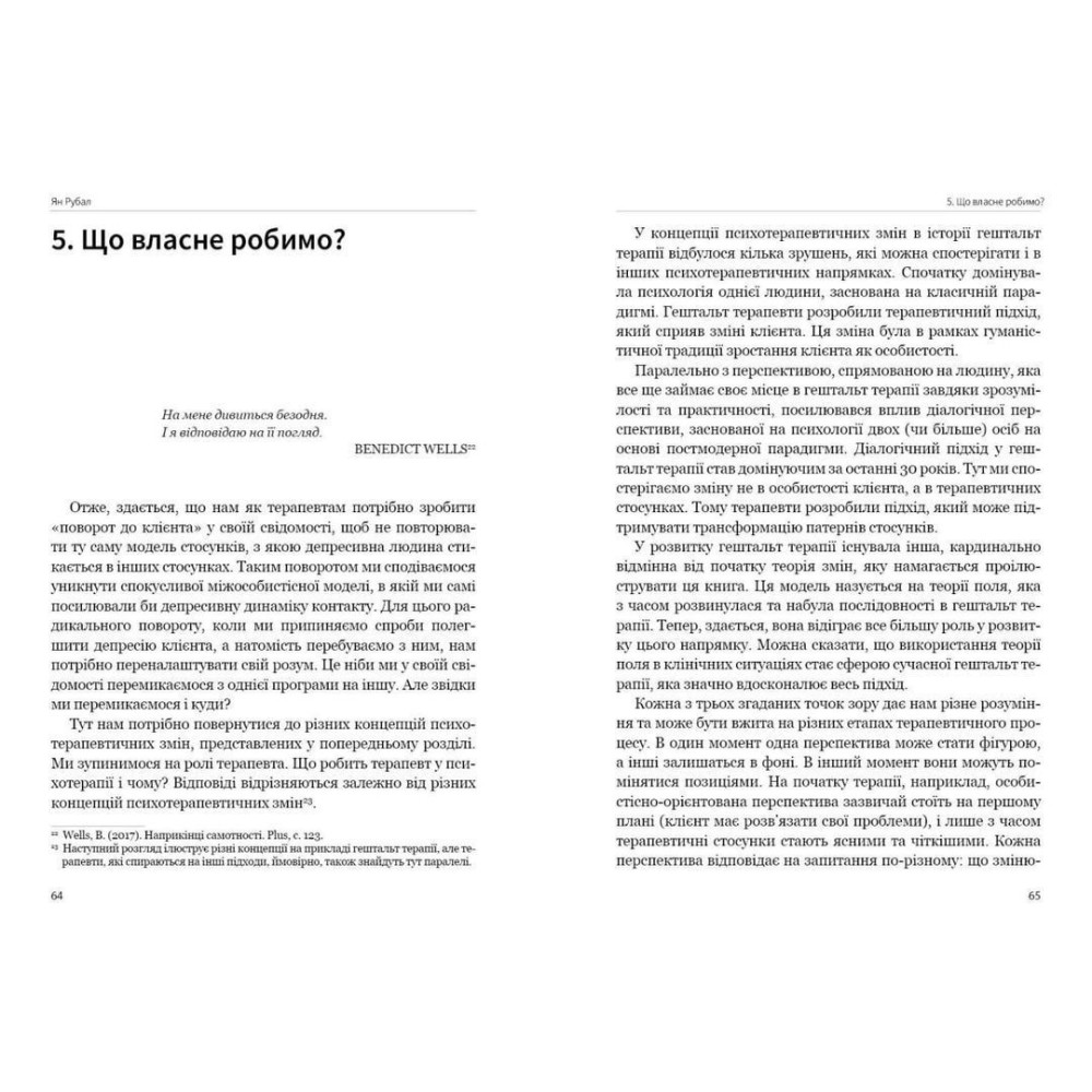 Фокус уваги перенесено з того, що ми робимо з клієнтом, на те, що відбувається з самим терапевтом в депресивному полі. Як свідчать дослідження автора, терапевти різних конфесій переживають схожий досвід, супроводжуючи темряву, нерухомість і страждання клієнта. Польова парадигма в гештальт-підході пропонує в першу чергу трансформувати досвід самого терапевта. Як терапевт цю складну ситуацію проживає, як її розуміє, як в ній орієнтується, що йому дає змогу впоратися з нею, та які він має можливості, щоб її змінити. Знайти йому опори, щоб його інтервенції не штовхали клієнта, але створювали можливість появи надії і зустрічі. Зрештою нам потрібно ризикнути собою, щоб дати шанс зустрітися з депресивною людиною.