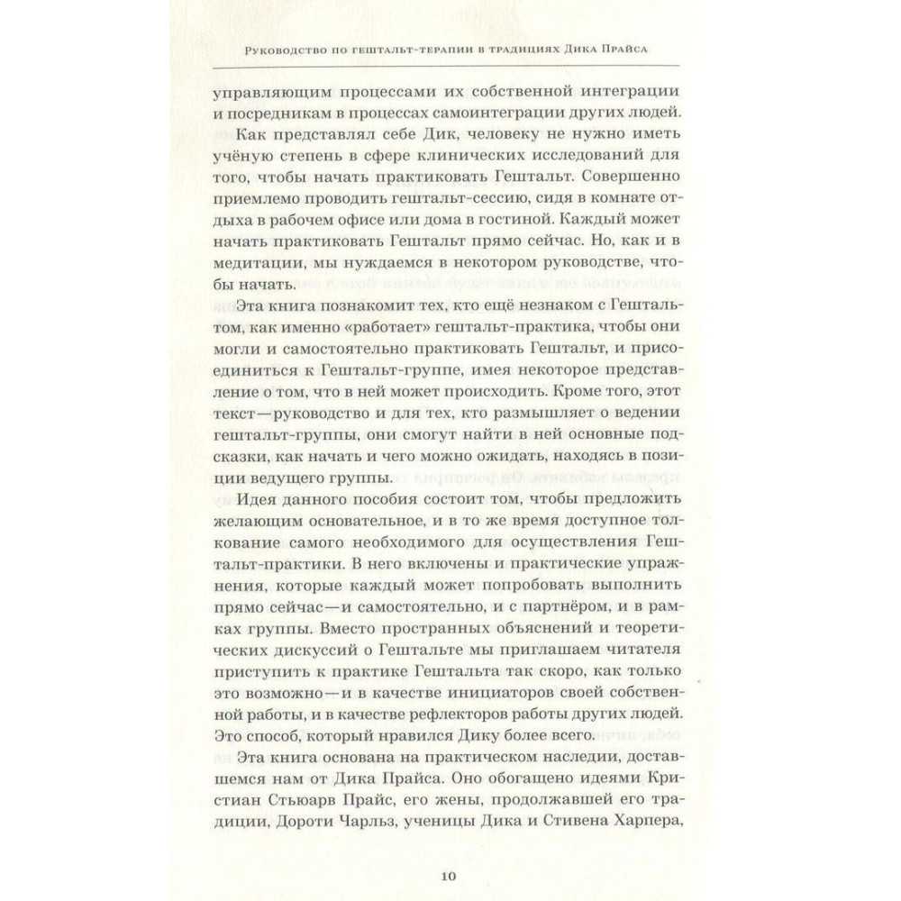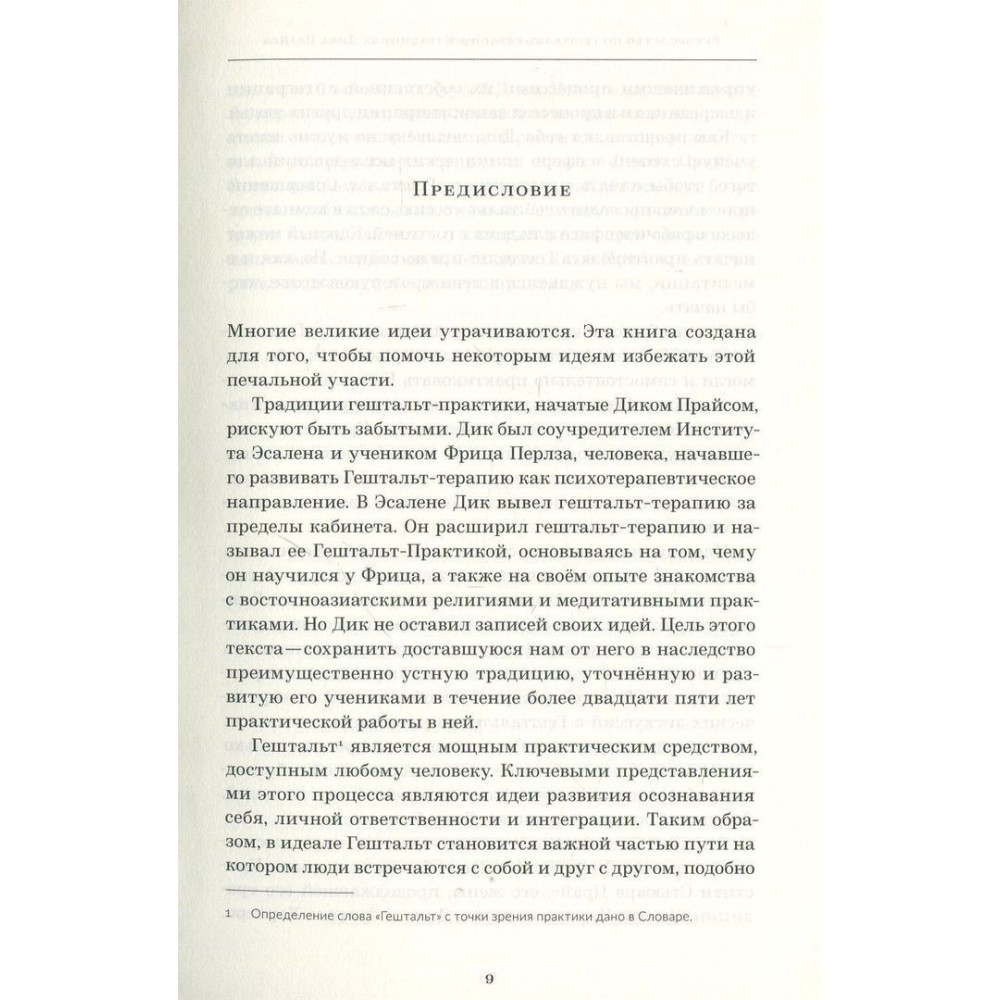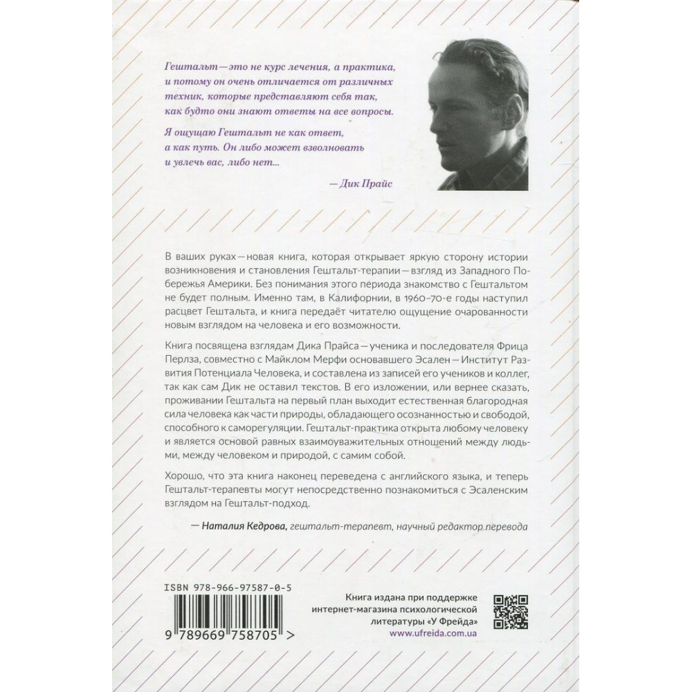 Книга присвячена поглядам Діка Прайса, учня та послідовника Фредеріка Перлза, одного із засновників Есалена — Інституту Розвитку Потенціалу Людини, вона складена із записів його учнів та колег, оскільки сам Дік не залишив текстів. У його викладі Гештальту на першому плані виходить природна шляхетна сила людини як частини природи, що володіє усвідомленістю та свободою, здатного до саморегуляції.