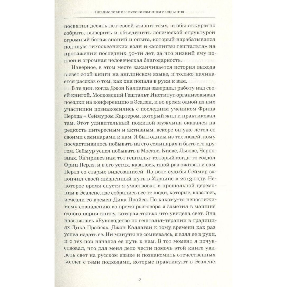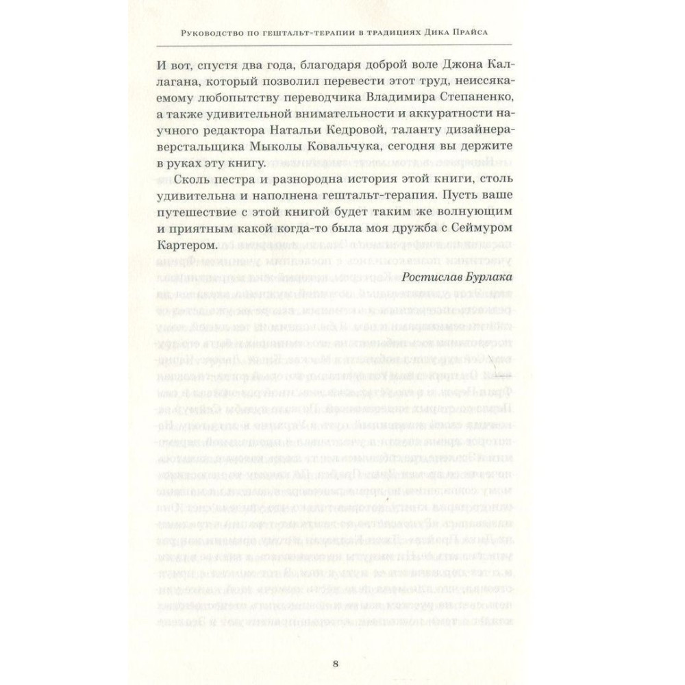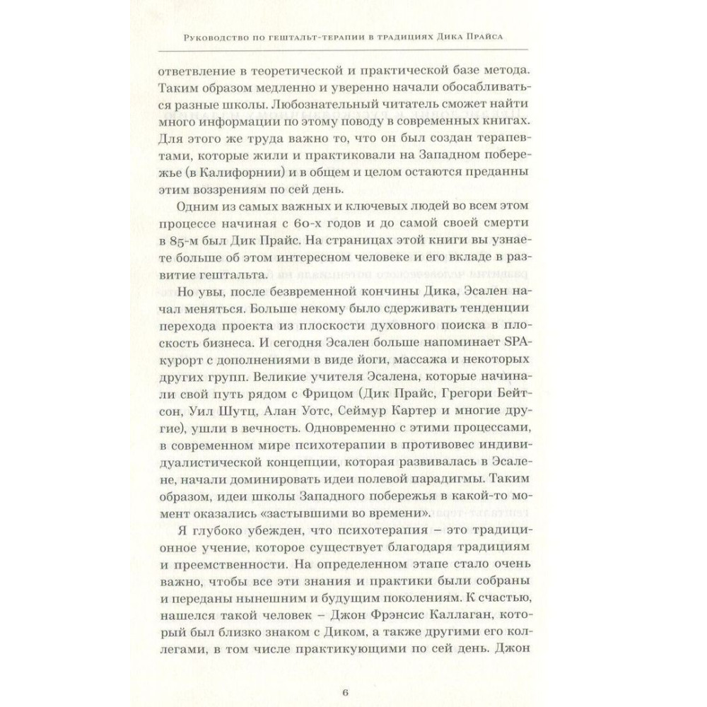 «Руководство по гештальт-терапии в традициях Дика Прайса» Джона Ф. Каллагана — книга, яка здається маловідомою у нас на боці історії виникнення Гештальт-терапії з поглядом на Західне Узбережжя, без якого знайомство з Гештальтом не буде повною стороною. Саме там був справжній його розквіт у 60-70-ті роки, а книга передає читачеві відчуття зачарованості з новим поглядом на людину та її можливості.