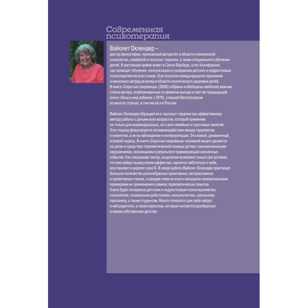 Книга «Скрытые сокровища. Путеводитель по внутреннему миру ребенка» від Вайолет Оклендер присвячена розробленій нею унікальній моделі роботи з дітьми, яка поєднує в собі теорію, філософію і практику гештальт-терапії з різноманітними виразними техніками. У книзі основний акцент робиться на цілях і засобах терапевтичної допомоги дітям з емоційними порушеннями, що виникли в результаті травмуючих життєвих подій. Як показує автор, зцілення можливе тільки за умови, що вони знайдуть вихід своїм афектам, навчаться піклуватися про себе, відновлять і зміцнять своє «Я».