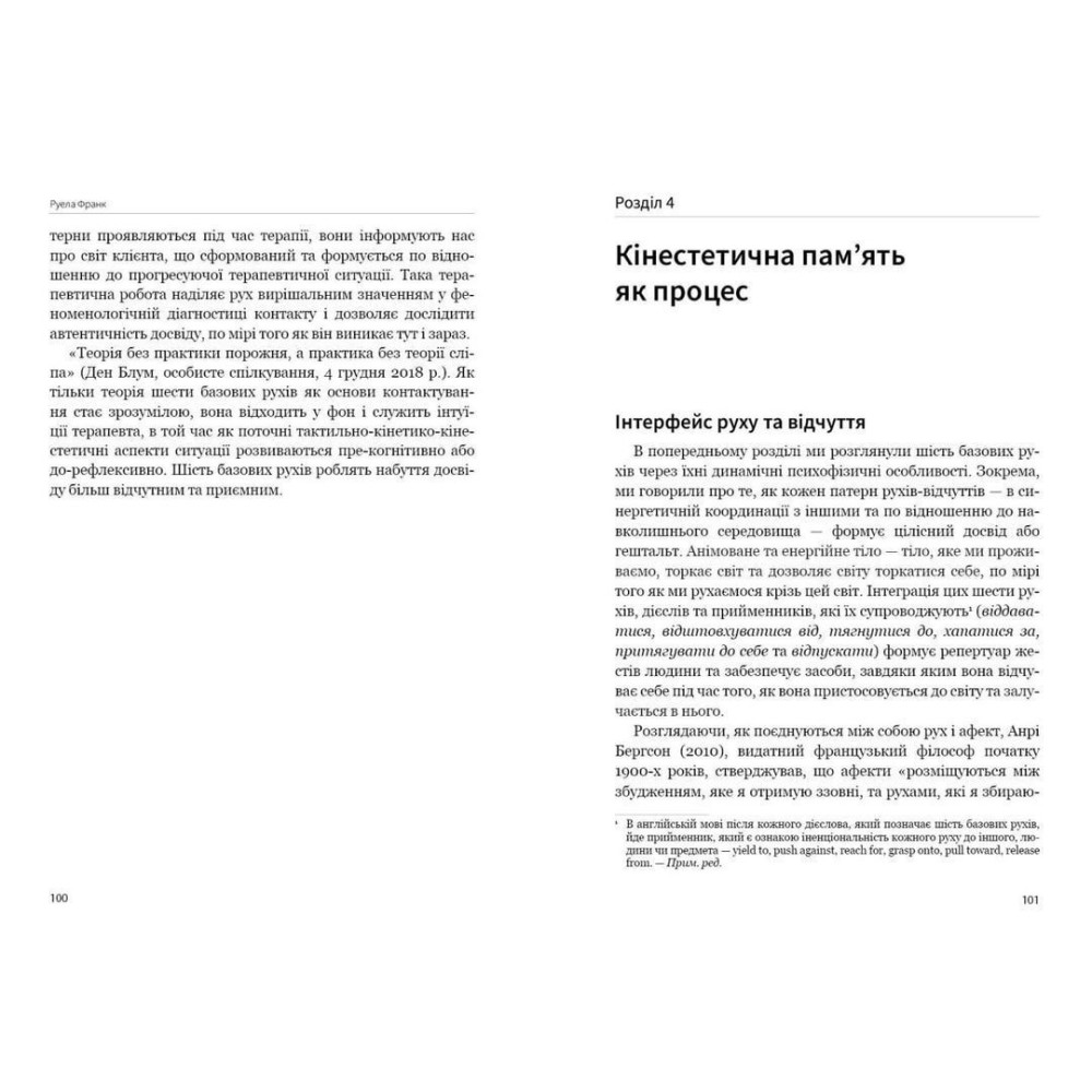 В книзі «Тілесні корені досвіду в психотерапії» від Руели Франк представлено феноменологічний погляд на формування та дослідження людського досвіду крізь призму рухів. Особливу увагу авторка приділяє тому, як формуються рухові наративи, якім завданням вони послуговуються та як можна відновити вільний потік рухів-відчуттів.