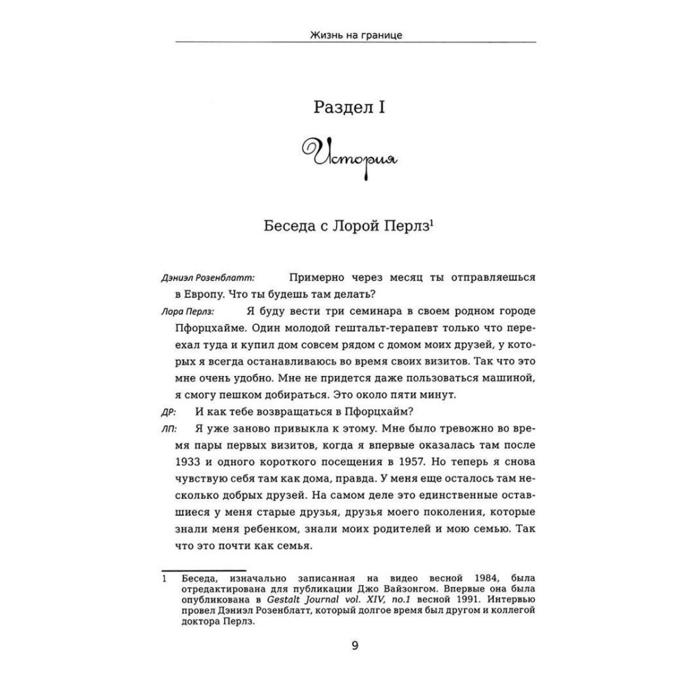 У книзі «Жизнь на границе» зібрані статті, лекції та стенограми груп Лори Перлз, починаючи з перших доповідей для Психоаналітичного товариства. Ця книга — дивовижна можливість познайомитися з тим, що насправді виявляється добре знайомим.