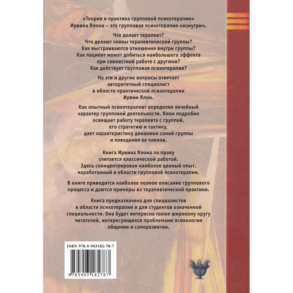 Книга Ірвіна Ялома «Групповая психотерапия. Теория и практика» по праву вважається класичною роботою. Тут сконцентровано найцінніший досвід, напрацьований у галузі групової психотерапії. У книзі наводиться найповніший опис групового процесу і даються приклади з терапевтичної практики.