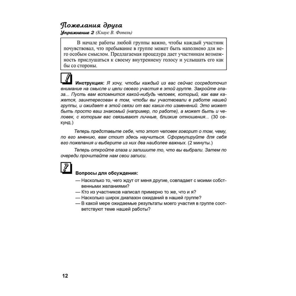 У практичному посібнику для психологів «Психологические группы: рабочие материалы для ведущего» за авторством Клауса Фопеля представлено різноманітні вправи, що істотно розширюють репертуар прийомів ведення груп і підвищують ефективність групової роботи.