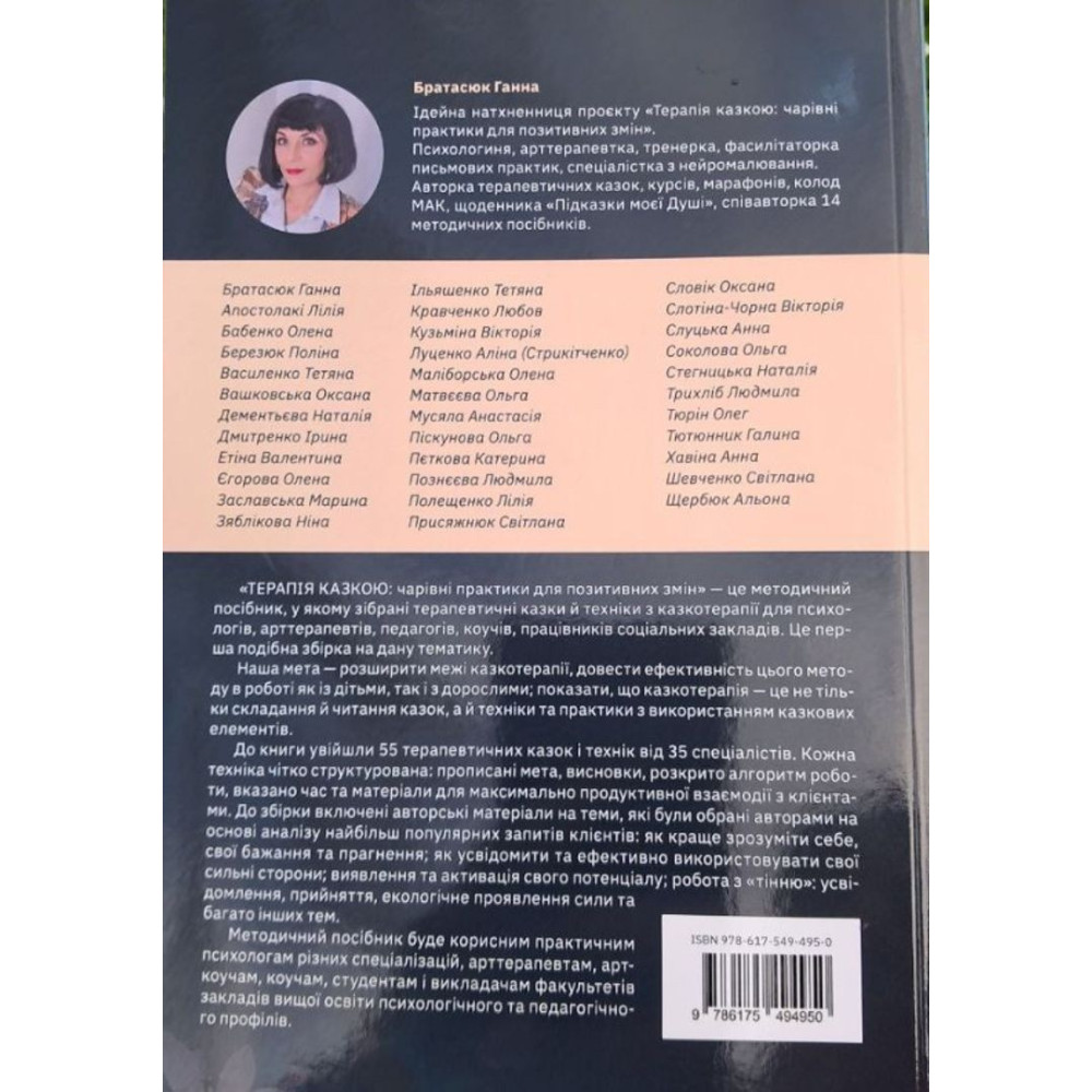 Збірка терапевтичних казок і практик «Терапія казкою: чарівні практики для позитивних змін» — це методичний посібник, у якому зібрані терапевтичні казки й техніки з казкотерапії для психологів, арттерапевтів, педагогів, коучів, працівників соціальних закладів. Це перша подібна збірка на дану тематику.