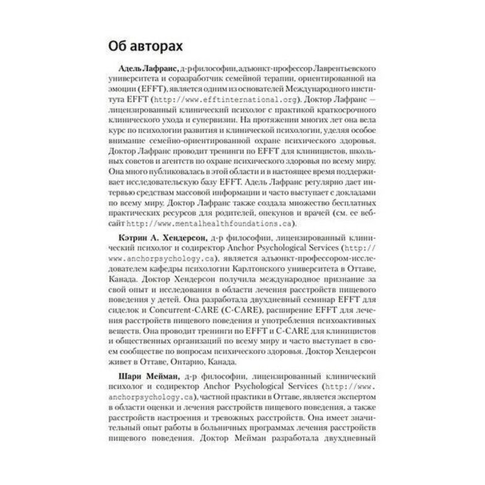 У посібнику з лікування «Фокусированная на эмоциях семейная терапия. Трансдиагностическая модель стратегий работы с близкими и родными пациентов с ментальными нарушениями» Адель Лафранс, Кетрін А. Хендерсон і Шері Мейман надають фахівцям у галузі психічного здоров'я рекомендації щодо впровадження сімейної терапії, орієнтованої на емоції (ФЕСТ), — захопливого нового методу, за яким особи, що здійснюють догляд, є основними агентами, що зцілюють, у лікуванні своїх близьких.