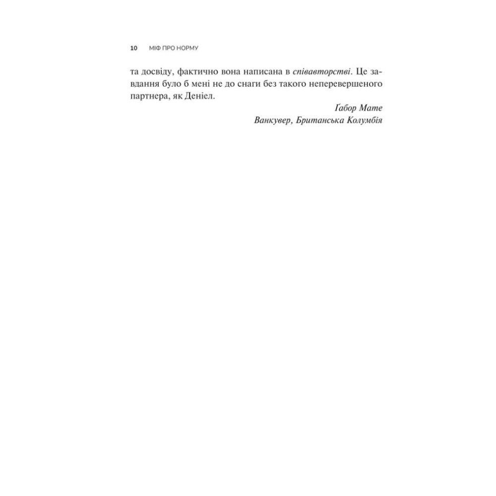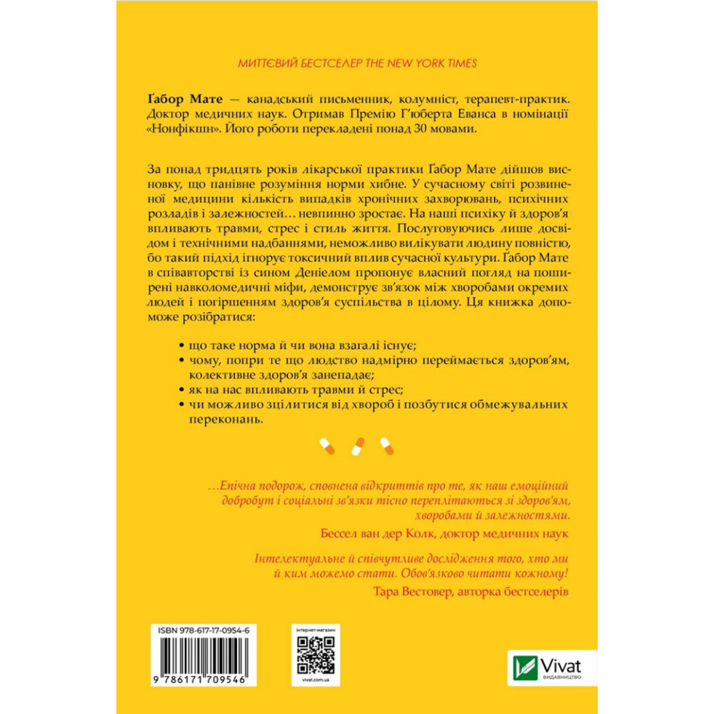 У своєму найамбітнішому творі «Міф про норму: травма, хвороба та зцілення в токсичній культурі» доктор Ґабор Мате (у співавторстві зі своїм сином, Деніелом Мате), один із найвідоміших у світі експертів з психічного здоров'я, залежностей та травм, розвінчує уявлення про «нормальність» у сучасному західному суспільстві. Він стверджує, що багато з того, що вважається нормальним — спосіб життя, робота, медицина, виховання, стосунки — насправді є хворобливими адаптаціями до глибоко травматизованого світу.