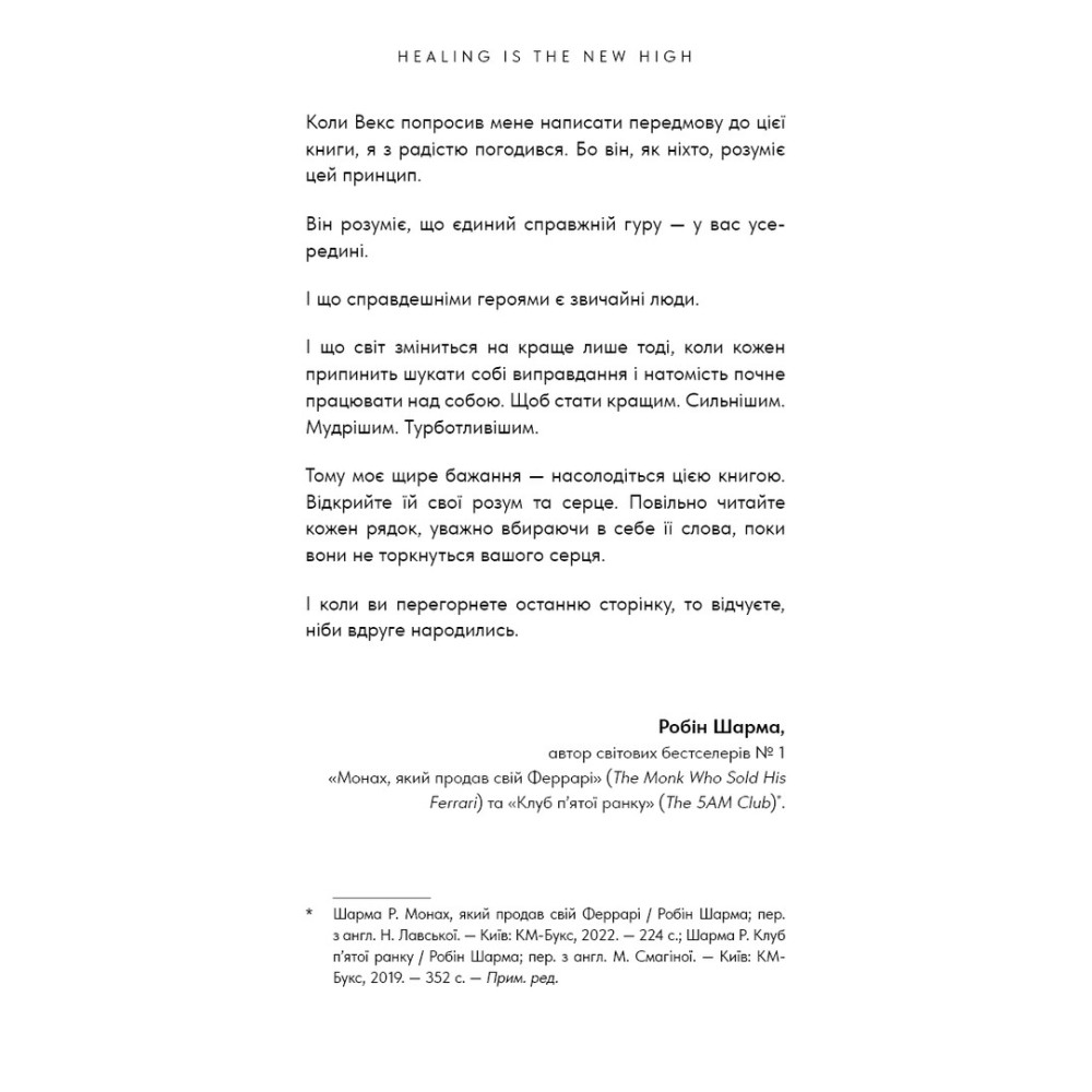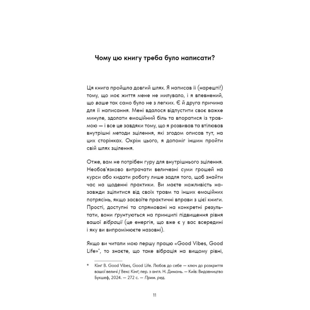 Нову книгу «Healing Is the New High. Посібник із подолання емоційних потрясінь і здобуття свободи» Векс Кінґ, автор бестселера «Good Vibes, Good Life», написав тому, що життя його не милувало, і він упевнений, що так само було в багатьох із нас. Однак йому вдалося відпустити своє тяжке минуле, здолати емоційний біль та впоратися із травмою — і все це завдяки тому, що Векс Кінґ розвивав та втілював внутрішні методи зцілення, які згодом описав на сторінках цієї книги. Окрім цього, він допоміг багатьом іншим людям пройти свій шлях зцілення.