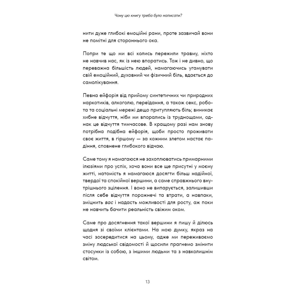 Нам не потрібен гуру для внутрішнього зцілення, упевнений автор. Необов’язково витрачати величезні суми грошей на курси або відмовлятися від чогось лише задля того, щоб знайти час на щоденні практики. Кожен має можливість назавжди зцілитися від своїх травм та інших емоційних потрясінь, якщо засвоїть практичні вправи з цієї книги. Прості, доступні та спрямовані на конкретні результати, вони ґрунтуються на принципі підвищення рівня вібрації.