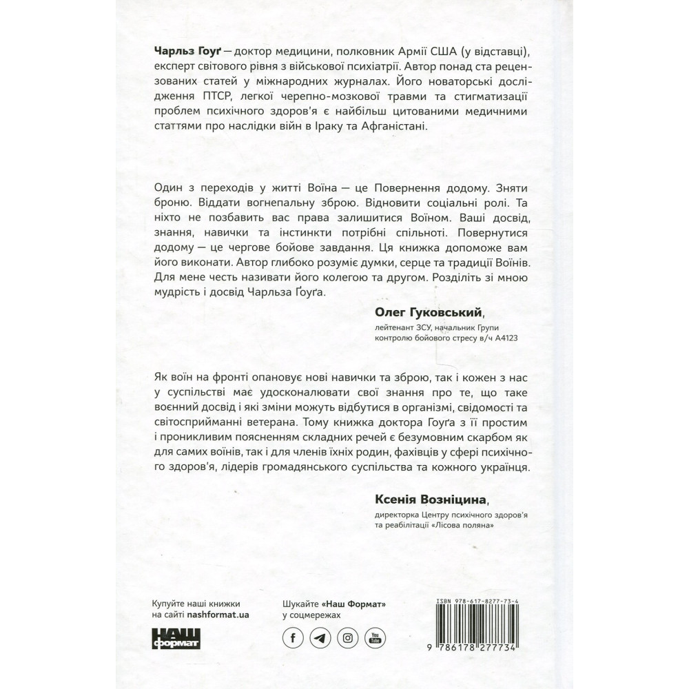 Зрозумілою практичною мовою доктор Гоуґ ділиться результатами новітніх досліджень про бойовий стрес, посттравматичний стресовий розлад, легкі черепно-мозкові травми, інші фізіологічні реакції на війну та варіанти їх лікування. Визнаючи, що і воїни, і члени їхніх родин змінюються під час бойових дій, він допомагає їм краще зрозуміти досвід один одного, особливо в контексті стійких навичок виживання в бойовому середовищі, які вдома часто розглядаються як «симптоми». Основна частина цієї книги зосереджена на тому, що необхідно для успішного переходу в тил.