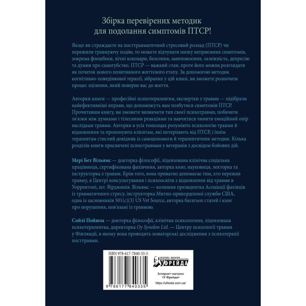 Мері Бет Вільямс та Сойлі Пойюла, які є професійними психотерапевтками і експертками з травми підібрали для книги «ПТСР. Робочий зошит. Ефективні методики подолання симптомів травматичного стресу» найефективніші вправи, що допоможуть вам позбутися симптомів ПТСР. Прочитавши книгу, ви зможете визначити тип своєї психотравми, побачити зв’язки між думками і тілесними реакціями та навчитися чинити емоційний опір наслідкам травми. Авторки в усіх тонкощах розуміють психологію травми й відновлення та пропонують клієнтам, які потерпають від ПТСР, і їхнім терапевтам стислий довідник із самодопомоги й терапевтичних методик. Кілька розділів книги присвячені психотравмам у ветеранів з досвідом бойових дій.