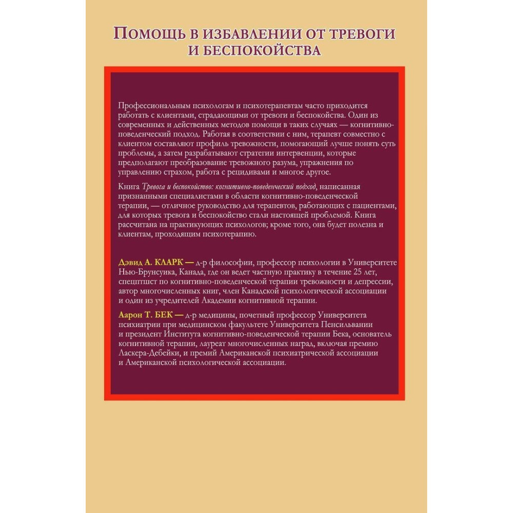 Професійним психологам і психотерапевтам часто доводиться працювати з клієнтами, які страждають від тривоги і занепокоєння. Один із сучасних і дієвих методів допомоги в таких випадках — когнітивно-поведінковий підхід, детально описаний у книзі Девіда А. Кларка і Аарона Т. Бека — «Тревога и беспокойство: когнитивно-поведенческий подход».