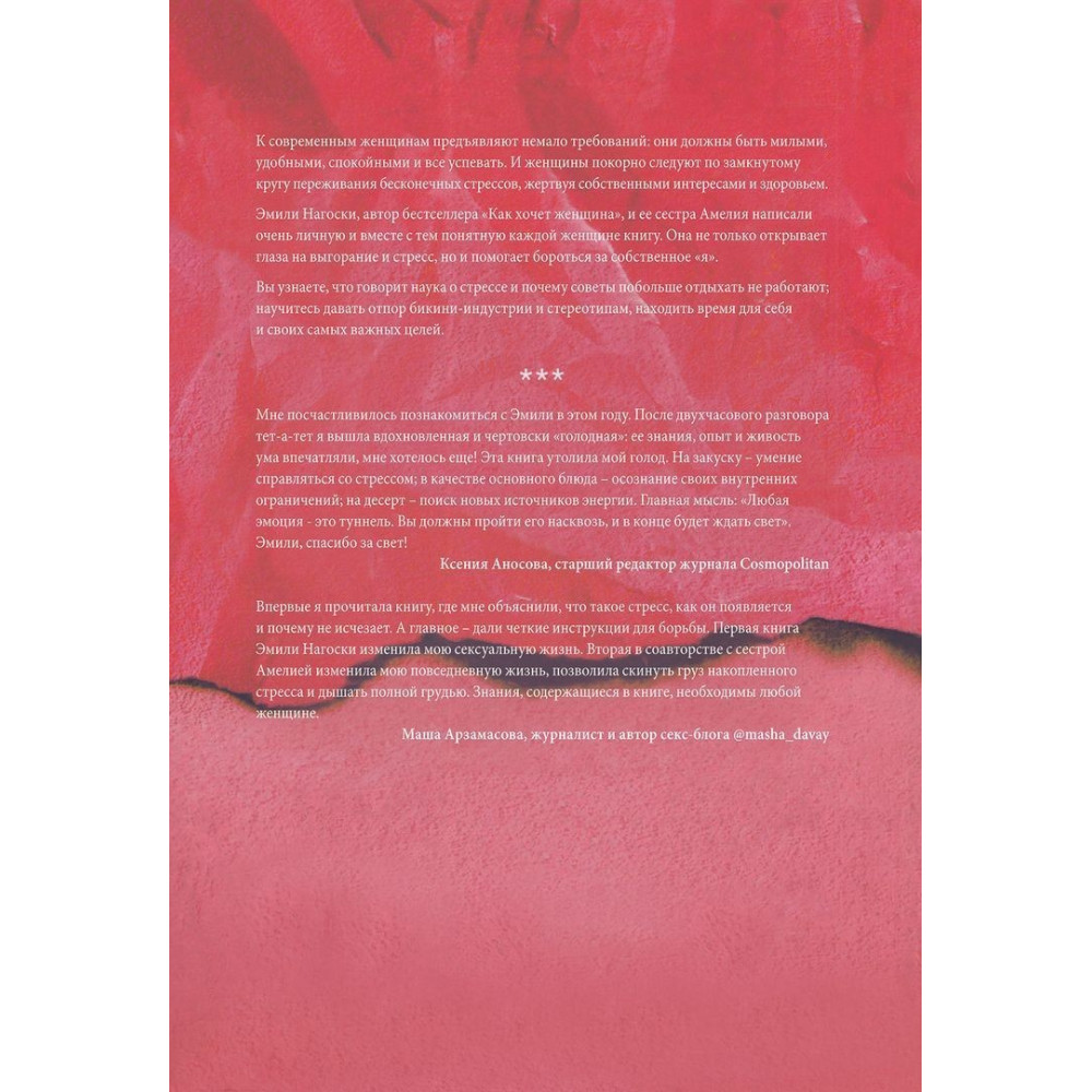 «Выгорание. Новый подход к избавлению от стресса» за авторством Емілі та Амелії Наґоскі — книга, яка запрошує сучасних жінок розглянути критичні вимоги до них і звільнитися від нескінченного стресу.