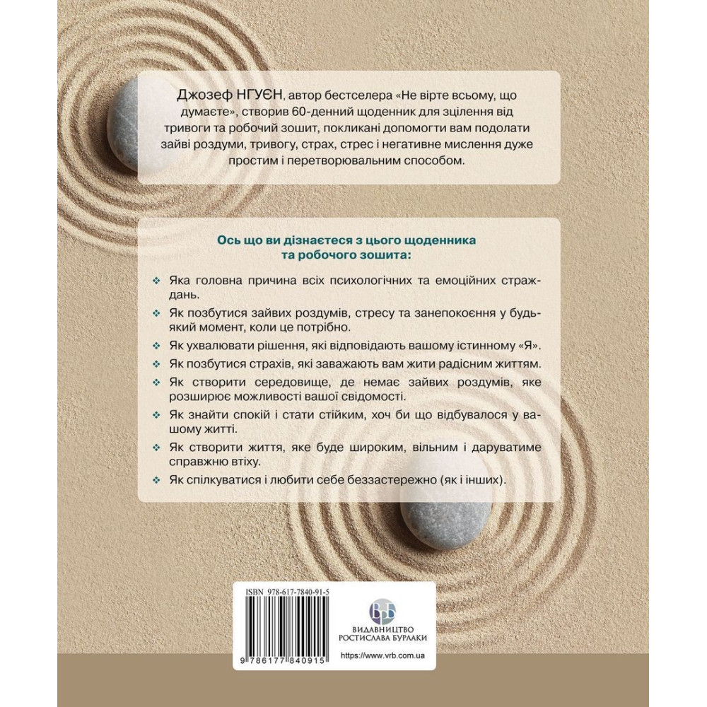 Джозеф Нгуєн, автор бестселера «Не вірте всьому, що думаєте», створив 60-денний щоденник для зцілення від тривоги та робочий зошит, які містить книга «Зцілення від тривоги та зайвих роздумів», що покликана допомогти вам подолати зайві роздуми, тривогу, страх, стрес і негативне мислення дуже простим і перетворювальним способом.