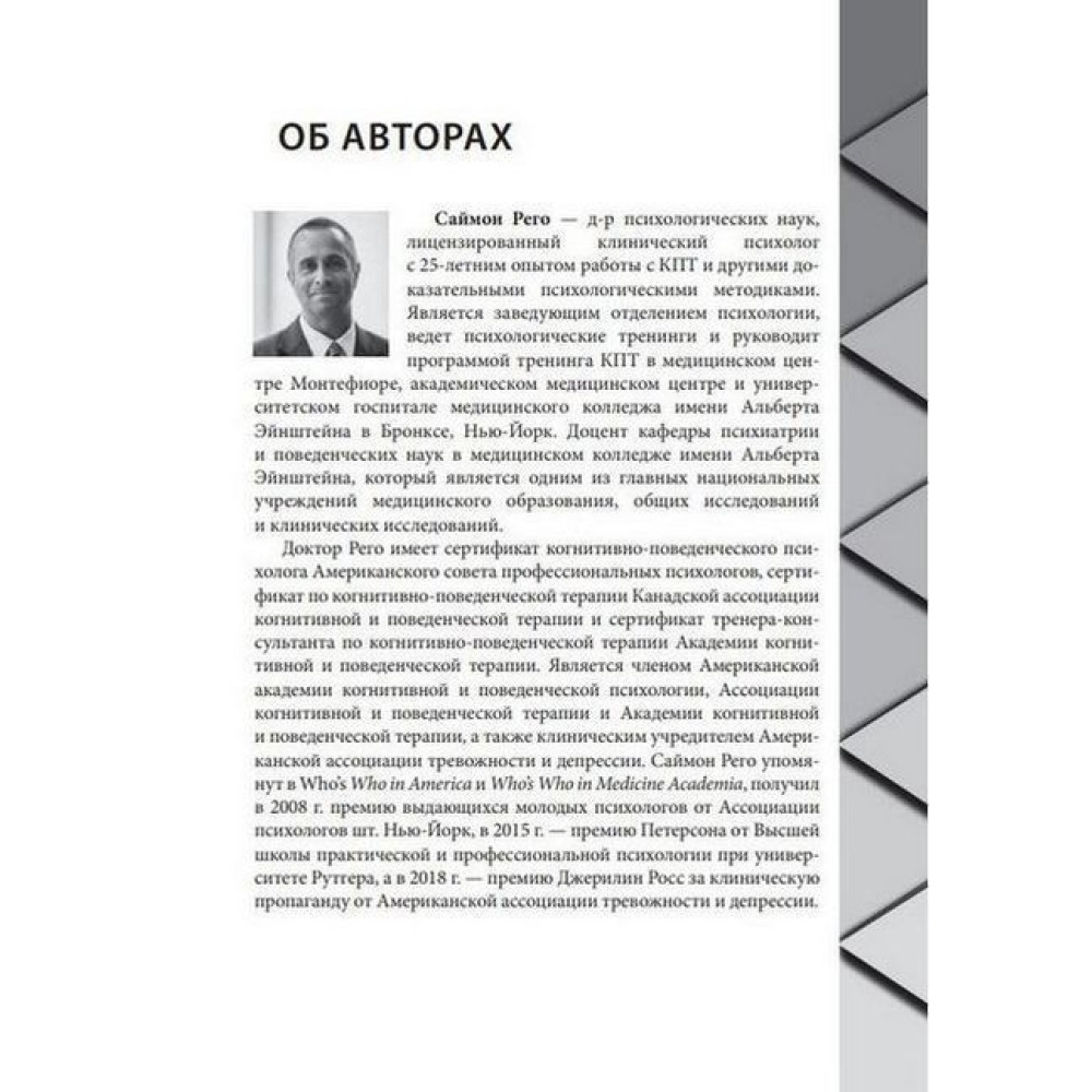 Саймон Рего — доктор психологічних наук, ліцензований клінічний психолог із 25-річним досвідом роботи з КПТ (когнітивно-поведінкова терапія) та іншими доказовими психологічними методиками. Є завідувачем відділення психології, веде психологічні тренінги та керує програмою тренінгу КПТ у медичному центрі Монтефіоре, академічному медичному центрі та університетському госпіталі медичного коледжу імені Альберта Ейнштейна в Бронксі, Нью-Йорк.