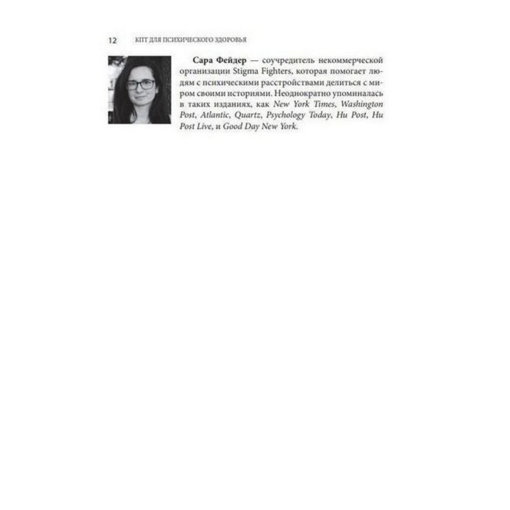 Сара Фейдер — співзасновниця некомерційної організації Stigma Fighters, яка допомагає людям із психічними розладами ділитися зі світом своїми історіями. Неодноразово згадувалася в таких виданнях, як New York Times, Washington Post, Psychology Today і Good Day New York тощо.